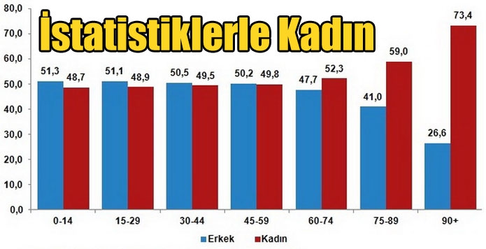 Adrese Dayalı Nüfus Kayıt Sistemi (ADNKS) sonuçlarına göre; 2020 yılında, kadın nüfus 41 milyon 698 bin 377 kişi, erkek nüfus 41 milyon 915 bin 985 kişi oldu. Diğer bir ifadeyle; toplam nüfusun %49,9'unu kadınlar, %50,1'ini ise erkekler oluşturdu. Kadınlar ile erkekler arasındaki bu oransal denge, kadınların daha uzun yaşaması nedeniyle, 60 ve daha yukarı yaş grubundan itibaren kadınların lehine değişti. Kadın nüfusun oranı, 60-74 yaş grubunda %52,3 iken 90 ve üzeri yaş grubunda %73,4 oldu.