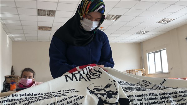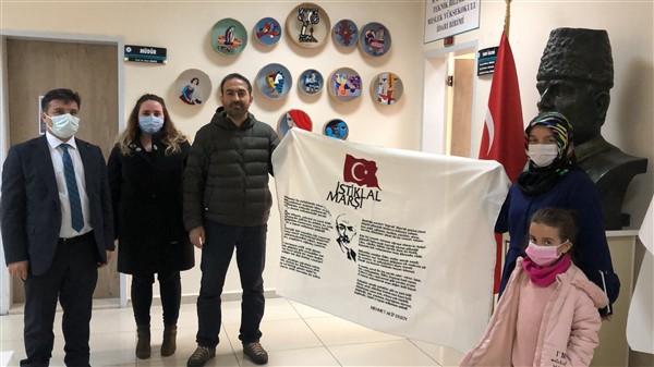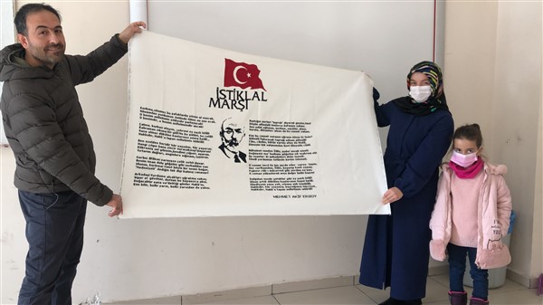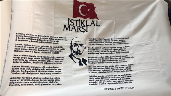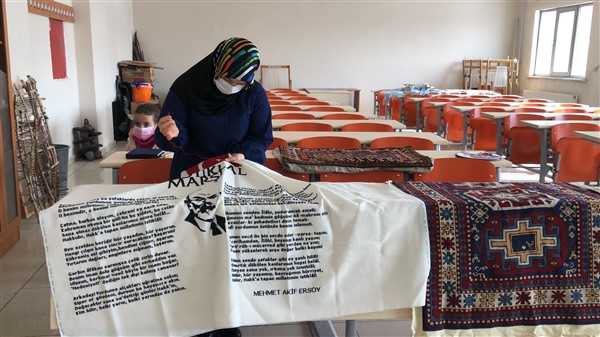 Kars Kafkas Üniversitesi Kazım Karabekir Teknik Bilimler Meslek Yüksek Okulu El Sanatları Bölümü Geleneksel El Sanatları Programı Bölüm Başkanı Öğretim Görevlisi Mustafa Akarslan’ın hazırladığı ve bölüm öğrencisi Melek Çil Şentürk tarafından “İstiklal Marşımızın Kabulünün 100. yılında” sunulmak üzere hazırlanan etamin nakış tekniği ile işlediği İstiklal Marşı ve Türk bayrağı çalışması büyük beğeni topladı.