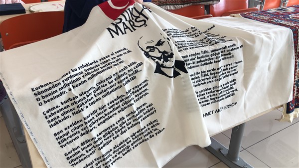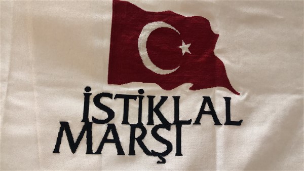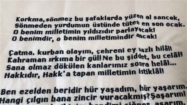 Bursa Keteni üzerine etamin tekniği ile her santimetre kareye sekiz iğne batışı ile yapılan ve yaklaşık bir yıl süren el emeği, göz nuru bu çalışma; şanlı bayrağımız ve Mehmet Akif Ersoy tarafından yazılan İstiklal Marşı, bu topraklar için mücadele veren tüm ecdadımızı rahmetle yâd etmenin önemini farklı bir şekilde yansıtmanın mutluluğunu yaşattı.