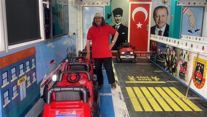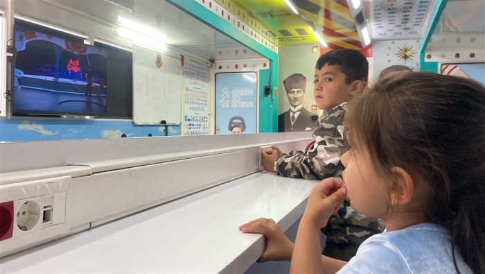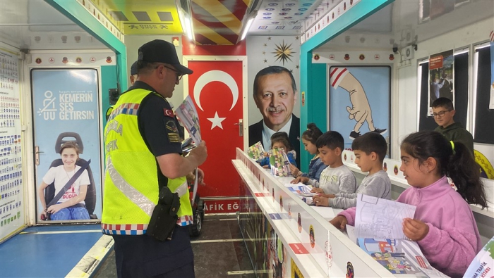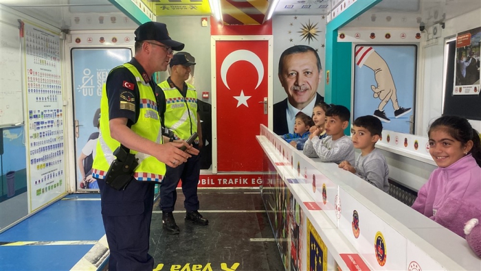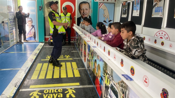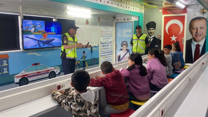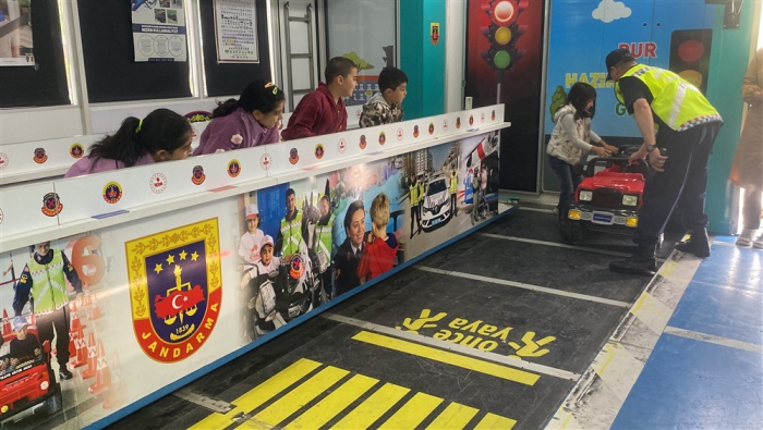 Jandarma tarafından hazırlanan çizgi film ile çocuklara trafik kuralları anlatıldı tırın içinde. kurulan trafik parkurunda çocuklara trafik ışıkları akülü araçlarla uygulamalı olarak gösterildi.