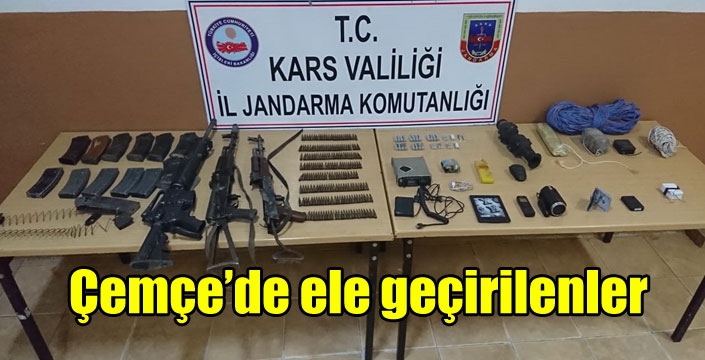 (1) adet M-16 piyade tüfeği, (2) adet AK-47 Kalaşnikof piyade tüfeği, (1) adet savunma tipi el bombası, (209) adet 5,56 mm fişek, (8) adet kütüklük, (8) adet şarjör, (1) adet termal dürbün, (1) adet Yaesu marka büyük telsiz, (1) adet Sony marka video kamera, (32) adet pil, (24) adet pil bloğu, (450) metre kablo, (1) adet kablo irtibatlı batarya bloğu, (50) Kg el yapımı patlayıcı karışımı, (2) adet hazırlanmış EYP tuzağı, bol miktarda EYP hazırlama malzemesi, (2) adet dolu küçük tüp, (5) çift Mekap ayakkabı, (1) adet şemsiye ile çok miktarda yaşam malzemesi ele geçirildi.