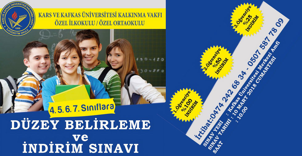Kars ve Kafkas Üniversitesi Kalkınma Vakfı özel ilk okulu / özel ortaokulu 4,5,6,7.’nci sınıflara Düzey Belirleme ve İndirim Sınavı yapacak.