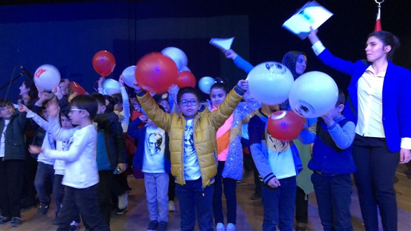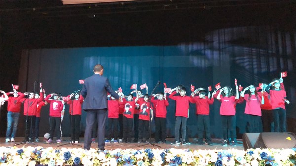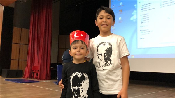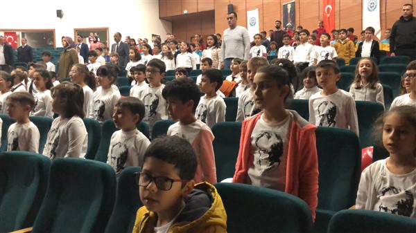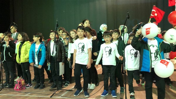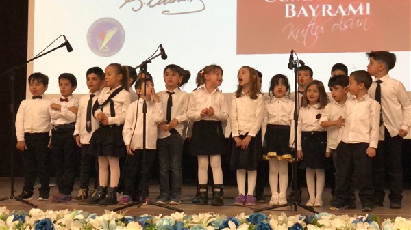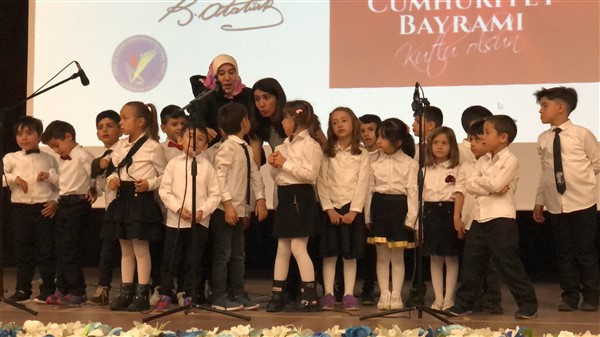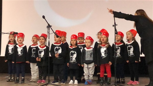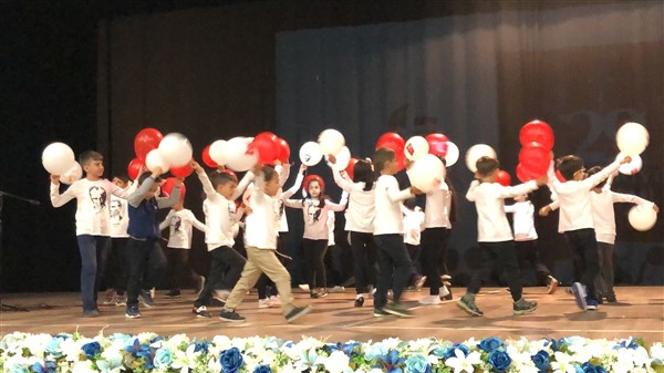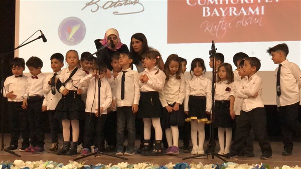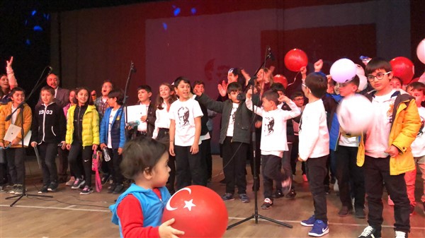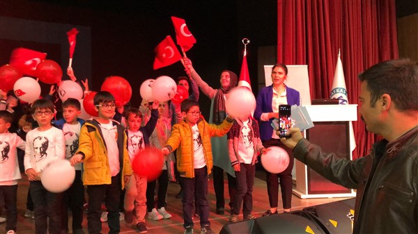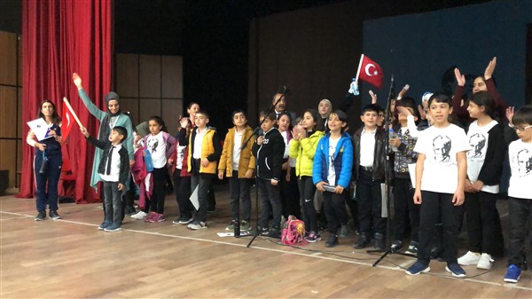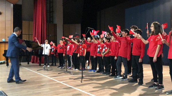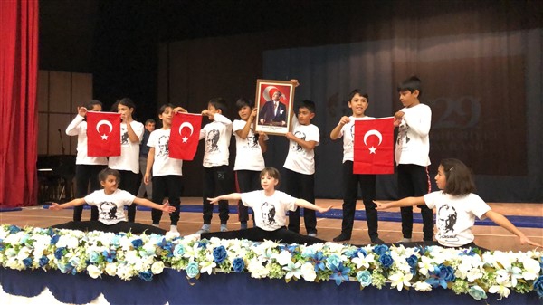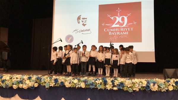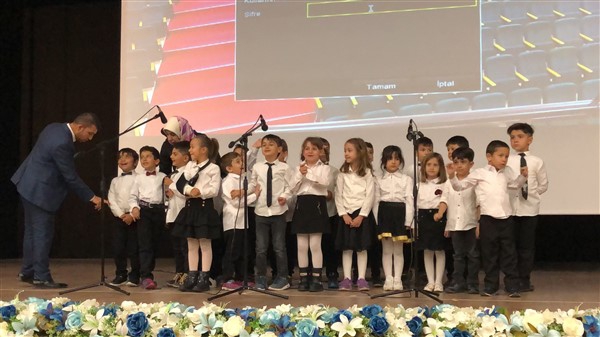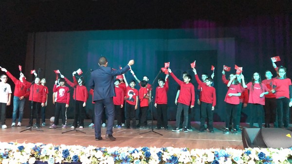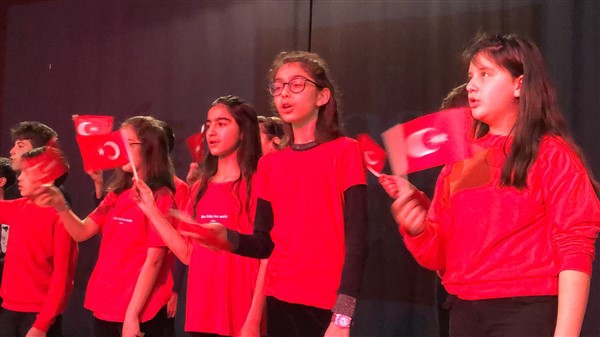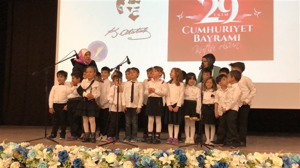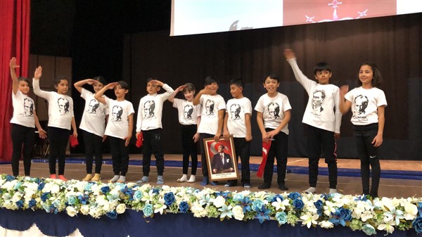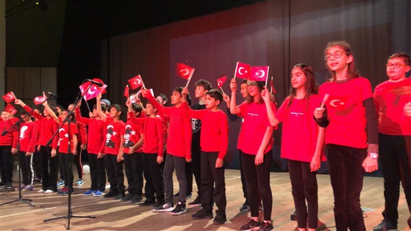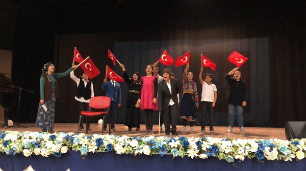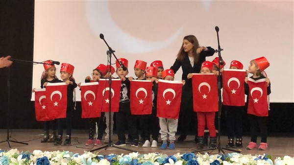 Minik öğrenciler “Atatürk Çocukları” marşıyla çıktıkları sahnede Ay-Yıldızlı giysileri ve ellerindeki Türk baraklarıyla Barış Pınarı Harekatında görev alan kahraman Mehmetçiklerimize selam durdular.