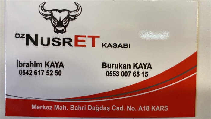 İşletmeciliğini İbrahim Kaya ve Korkmaz Usta’nın yaptığı Nusret Kasabı Kars’ta Ortakapı Mahallesi Bahri Dağdaş Caddesi No:A18 adresinde hizmete açıldı. Tlf: İbrahim Kaya 0542617 52 50 Korkmaz Usta: 0536 438 58 53