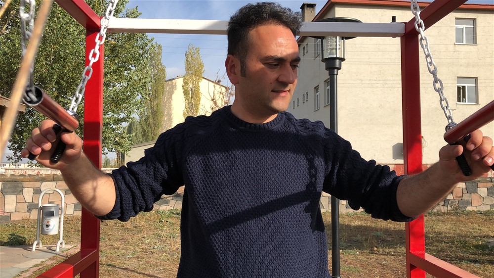 Kars’ın Selim İlçesi’nde Gıyasettin Güneş, engelli kardeşi Kezban Güneş’in spor ve egzersiz yaparak hayata tutunması için patentli projesini parkta hayata geçirdi.