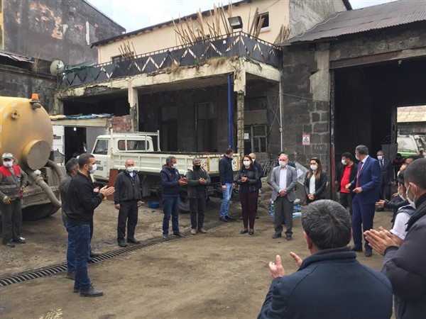 Kars Belediyesi Başkanı Ayhan Bilgen ve Şevin Alaca, Başkan Yardımcıları ile birlikte çalışanların 1 Mayıs İşçi ve Emekçiler Bayramını kutlamak üzere bugün belediyeye ait hizmet binaları ve tesisleri ziyaret etti.