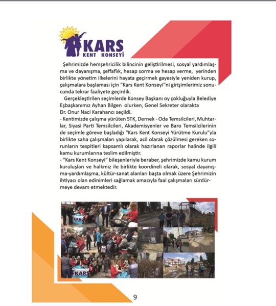 -Kentimizde çalışma yürüten STK, Dernek - Oda Temsilcileri, Muhtarlar, Siyasi Parti temsilcileri, Akademisyenler ve Baro Temsilcilerinin de seçimle göreve başladığı “Kars Kent Konseyi Yürütme Kurulu”yla birlikte saha çalışmaları yapılarak, acil olarak çözülmesi gereken sorunların tespitleri kapsamlı olarak hazırlanan raporlar halinde ilgili kamu kurumlarına teslim edilmiştir.