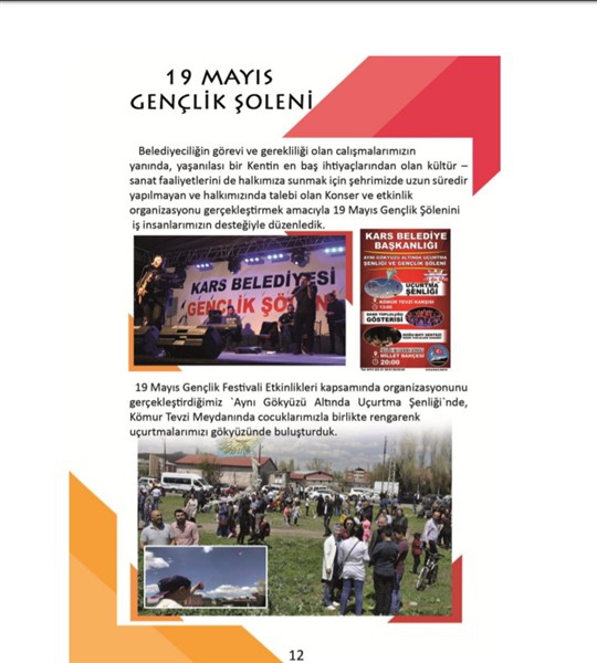 -Belediyeciliğin görevi ve gerekliliği olan çalışmalarımızın yanında yaşanılası bir Kentin en baş ihtiyaçlarından olan kültür – sanat faaliyetlerini de halkımıza sunmak için Şehrimizde uzun süredir yapılmayan ve halkımızın da talebi olan Konser ve etkinlik organizasyonu gerçekleştirmek amacıyla 19 Mayıs Gençlik Şölenini Esnafımızın ve İş İnsanlarımızın desteğiyle düzenledik.