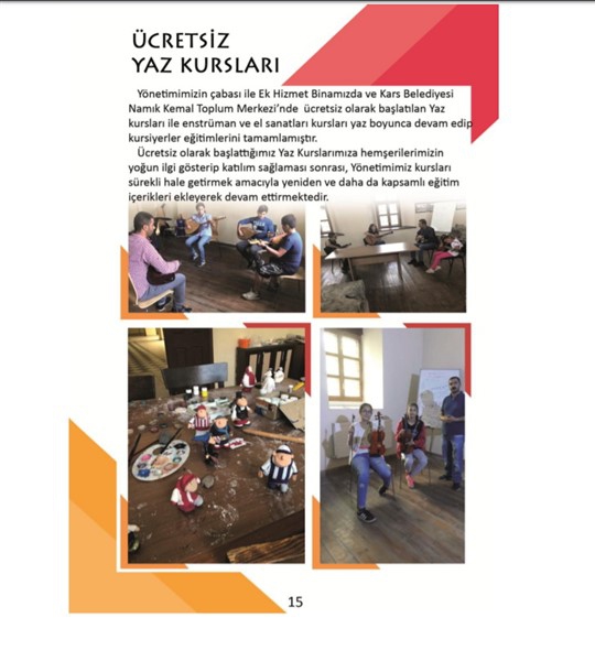 - Yönetimimizin çabası ile Ek Hizmet Binamızda ve Kars Belediyesi Namık Kemal Toplum Merkezi’nde ücretsiz olarak başlatılan Yaz kursları ile enstrüman ve el sanatları kursları yaz boyunca devam edip kursiyerler eğitimlerini tamamlamıştır.