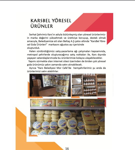 -Serhat Şehrimiz Kars’ın adıyla bütünleşmiş olan yöresel ürünlerimizin marka değerini yükseltmek ve üreticiye koruyup, destek olmak amacıyla; Belediyemize ait olan Beltaş A.Ş çatısı altında “KarsBel Yöresel Gıda Ürünleri” markasını ağustos ayı içerisinde oluşturduk.