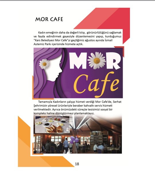 -Tamamıyla Kadınların çalışıp hizmet verdiği Mor Cafe’de, Serhat Şehrimizin yöresel ürünleriyle beraber kahvaltı servis hizmeti verilmektedir.Tesisimizi önümüzdeki süreçte tamamıyla sosyal bir kompleks haline dönüştürmeyi planlamaktayız.
