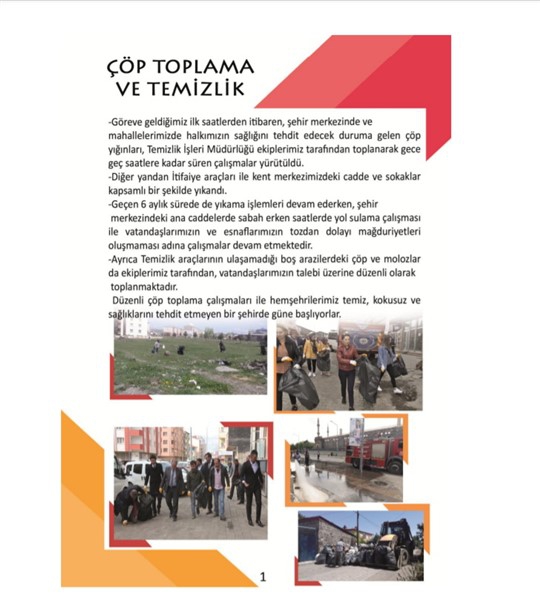-Göreve geldiğimiz ilk saatlerden itibaren, şehir merkezinde ve mahallelerimizde halkımızın sağlığını tehdit edecek duruma gelen çöp yığınları Temizlik İşleri Müdürlüğü ekiplerimiz tarafından toplanarak, gece geç saatlere kadar süren temizlik çalışmaları sürdürüldü.