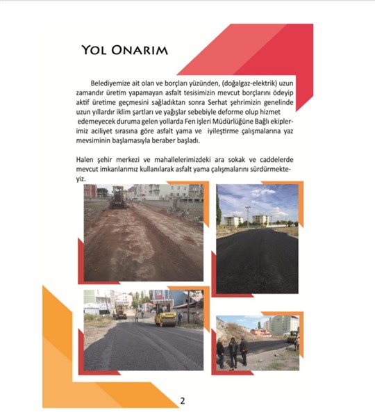 -Belediyemize ait olan ve borçları yüzünden(elektrik-doğalgaz) uzun zamandır üretim yapamayan asfalt tesisimizin mevcut borçlarını ödeyip, aktif üretime geçmesini sağladıktan sonra Serhat Şehrimizin genelinde uzun yıllardır iklim şartları ve yağışlar sebebiyle deforme olup hizmet edemeyecek duruma gelen yollarda Fen işleri Müdürlüğüne Bağlı ekiplerimiz durum analizi yaparak, aciliyet sırasına göre asfalt yama ve çeşitli yol iyileştirme çalışmalarına yaz mevsiminin başlamasıyla beraber başladı.