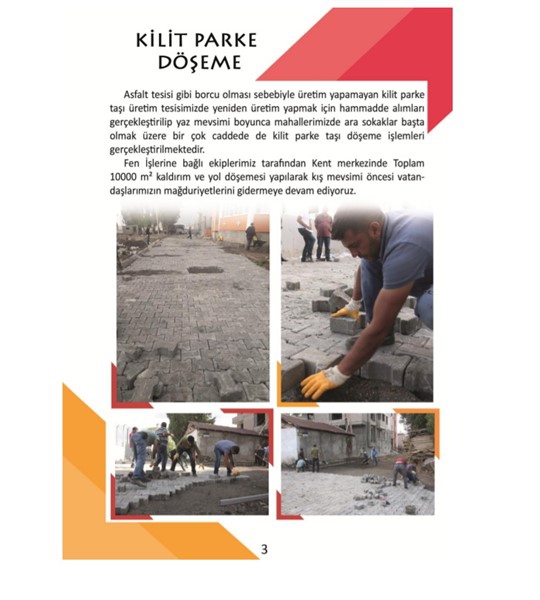 Asfalt tesisi gibi borcu olması sebebiyle üretim yapamayan kilit parke taşı üretim tesisimizde yeniden üretim yapmak için hammadde alımları gerçekleştirip yaz mevsimi boyunca mahallelerimizde ara sokaklar başta olmak üzere bir çok caddede de kilit parke taşı döşeme işlemleri gerçekleştirilmektedir.