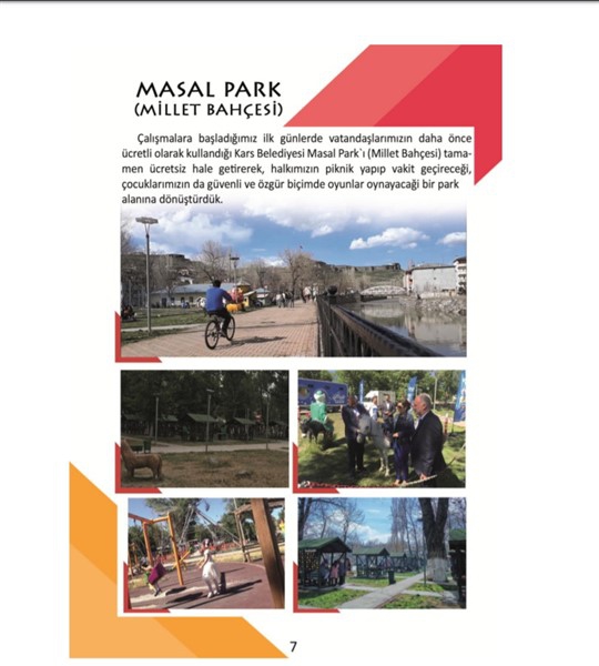 Göreve geldiğimiz ilk günlerde vatandaşlarımızın daha önce ücretli olarak kullandığı Kars Belediyesi Masal Park`ı (Millet Bahçesi) tamamen ücretsiz hale getirerek halkımızın piknik yapıp vakit geçireceği, çocuklarımızın da güvenli ve özgür biçimde oyunlar oynayacağı bir park alanına dönüştürdük.