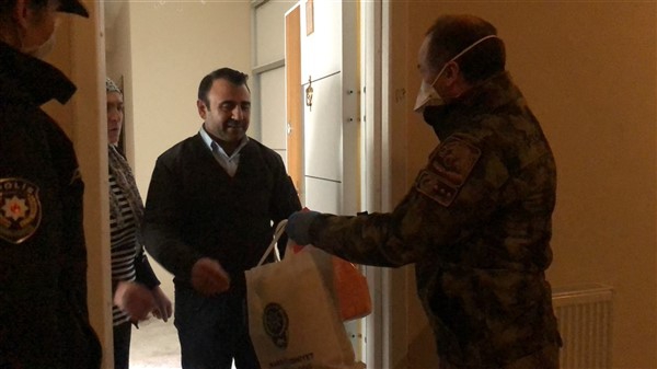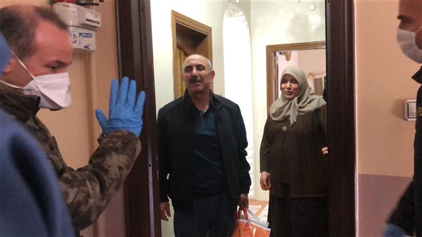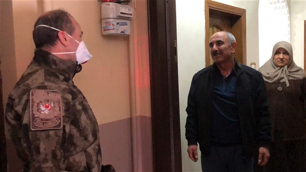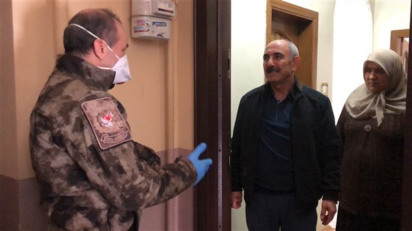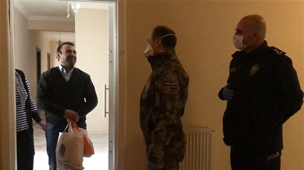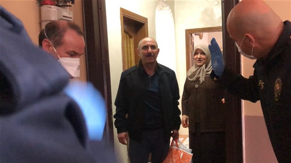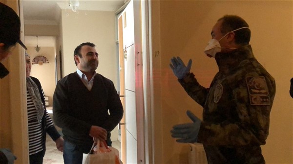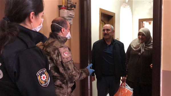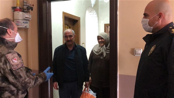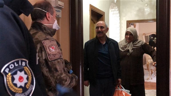 Maske ve eldiveniyle aileleri ziyarete giden Emniyet Müdürü Yavuz Sağdıç, “Daha önce biliyorsunuz 10 Nisan Polis Haftasında sizleri davet ediyorduk. Sağolun sizlerde geliyordunuz. Ama şimdi bu sağlın hastalıktan dolayı her hangi bir etkinlik yapmıyoruz. Ama biz yine sizleri unutmadık. Geldik ve size ‘bir ihtiyacınız var mı’ diye sormak istedik. Bizler böyle maskeli ve eldivenli geldik ki sizlere bir zararımız olmasın. Onun için içeri girmeyeceğiz. Böyle kapıdan hal ve hatırınızı soruyoruz. Allah sizleri var etsin. Bir isteğiniz arzunuz olduğu zaman bize haber veriyorsunuz ve bizler anında size geliyoruz. İnşallah bu süreci atlatacağız ve bizler size geleceğiz, o zaman çayınızı da içeceğiz. ” dedi.