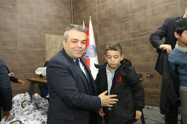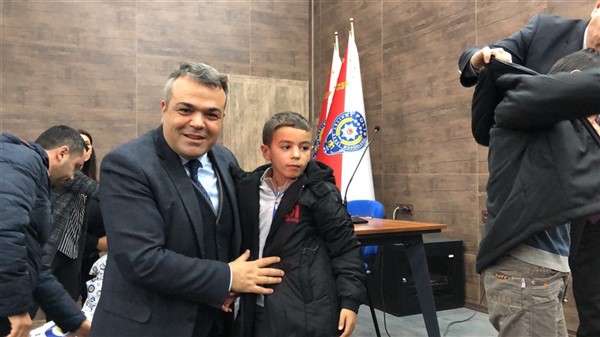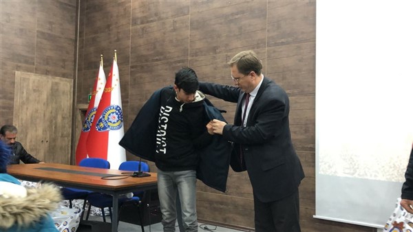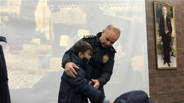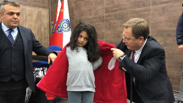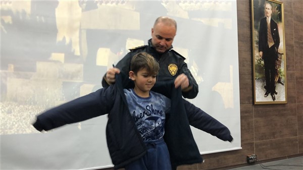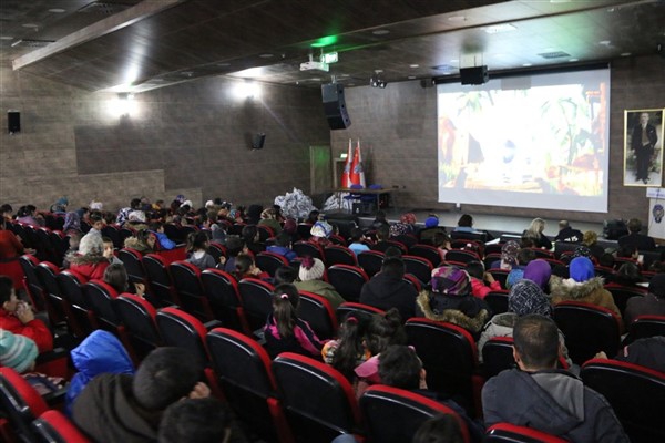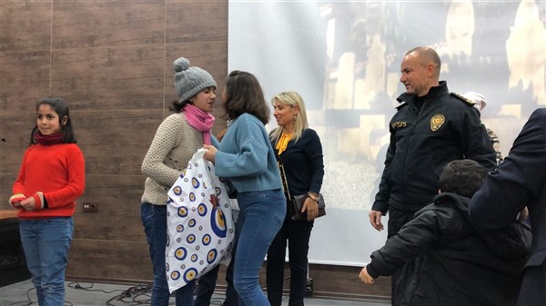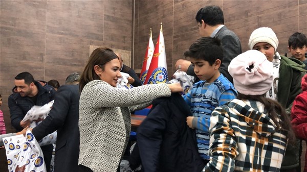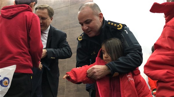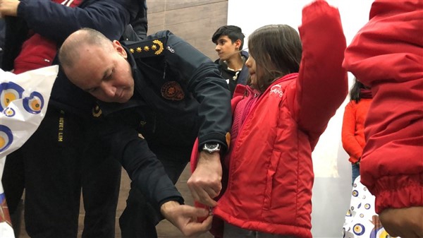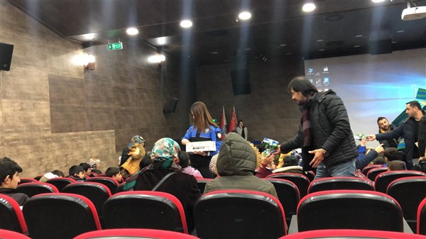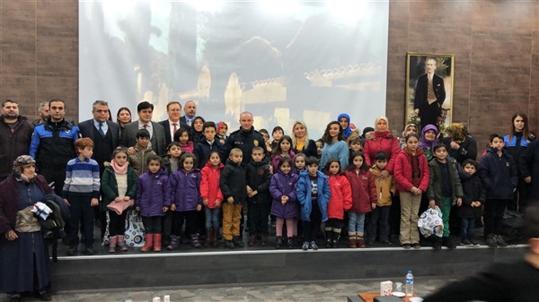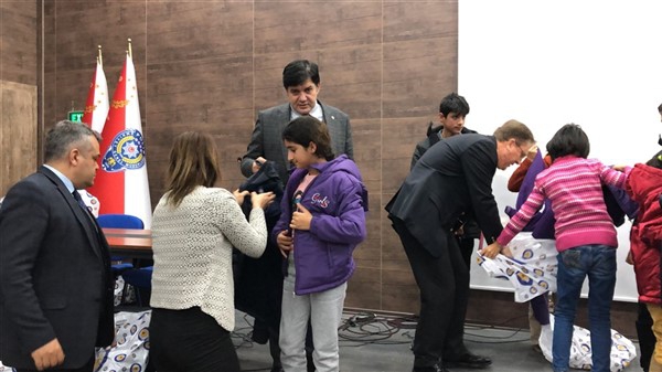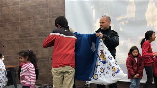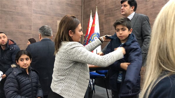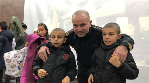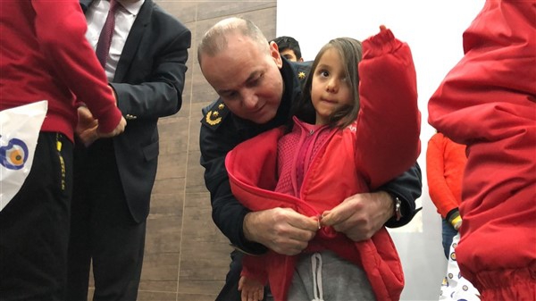 Daha sonra 1 saatlik bir çocuk filmi izlettirildi. Filmden sonra da Emniyet Müdürü Yavuz Sağdıç, eşi ve çocuklarıyla mont dağıtımı yaptı. Çocuklara montları kendi eleriyle giydiren Sağdıç, sohbet de ederek mutluluklarını paylaştı.