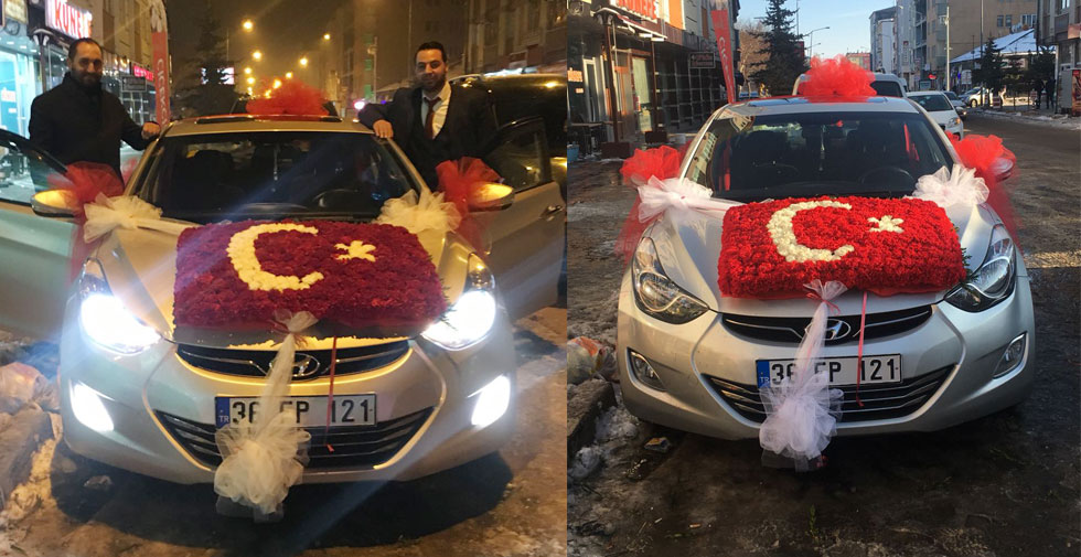 Son olarak geçtiğimiz günlerde Hülya ve Okan çifti gelin arabasını Türk bayraklı güllerle donattı.