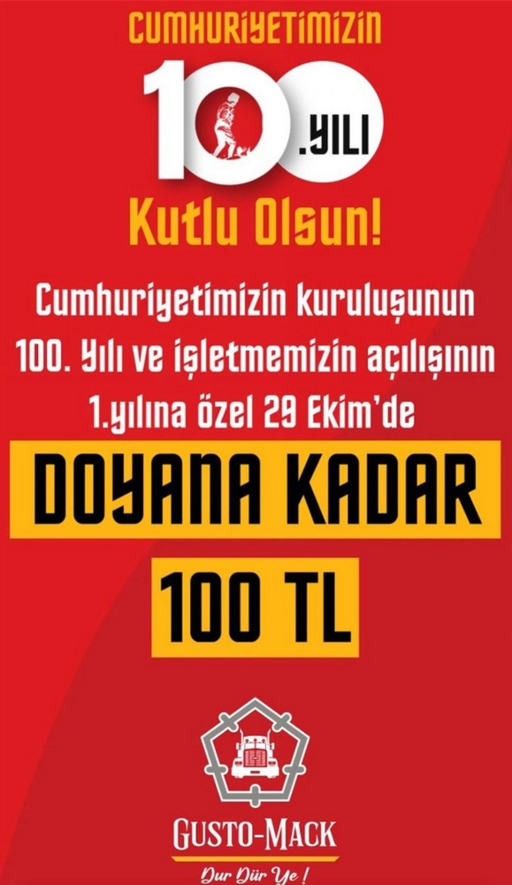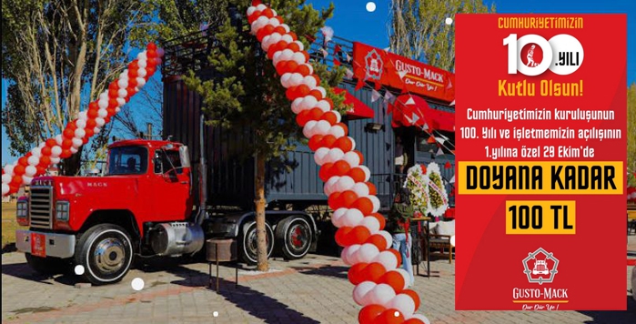 Kars GUSTO MACK’de Cumhuriyetimizin kuruluşunun 100. Yılı ve İşletmemizin açılışının 1. Yılına özel 29 Ekim de Doyana kadar 100 TL