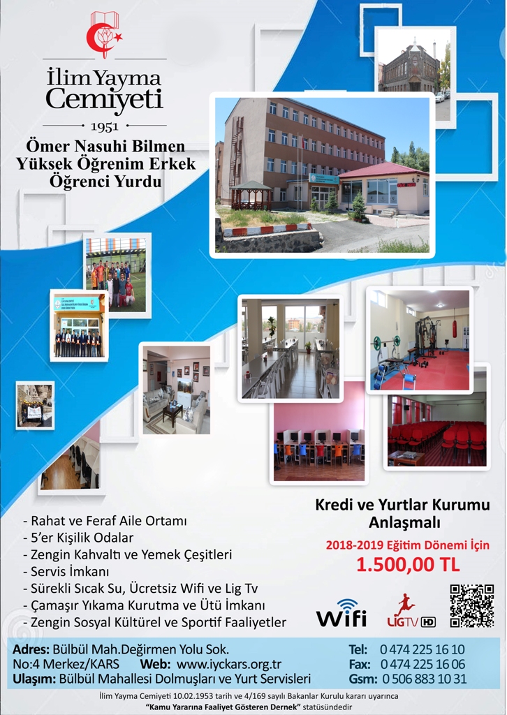 İlim Yayma Cemiyeti Kars Şubesi’ne bağlı olarak faaliyette bulunan Ömer Nasuhi Bilmen Yüksek Öğretim Erkek Öğrenci Yurdu kayıtları başladı. İlim Yayma Cemiyeti Kars Şube Başkanı Ebubekir KELEŞ; Kafkas Üniversitesi merkez kampusunda öğrenim görecek olan tüm erkek öğrencilerimize üniversite eğitimi süresince pratik yaşama rahatlığı sağlayan imkanları, akademik ve sosyal hayatınızı destekleyen faaliyetleriyle sizlere huzurlu, güvenli ve hijyenik bir yurt ortamı sunuyoruz. Yurtlarımızın çok amaçlı olduğunu dile getirerek, şunları söyledi:.