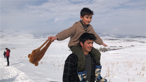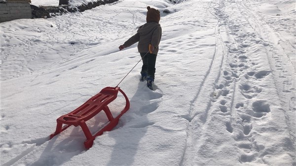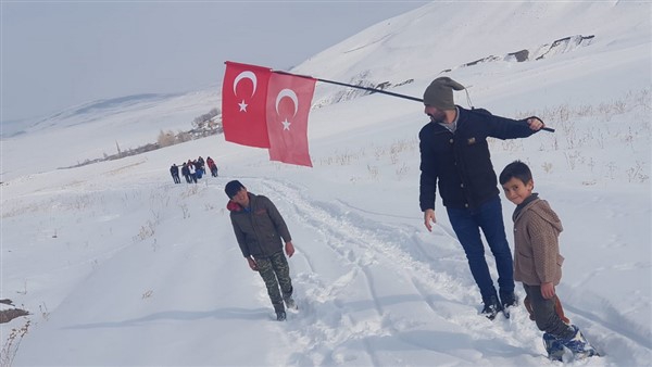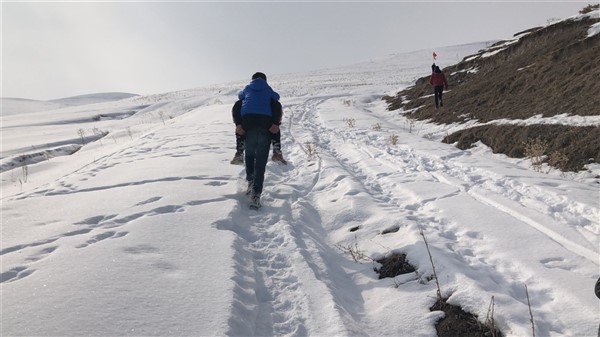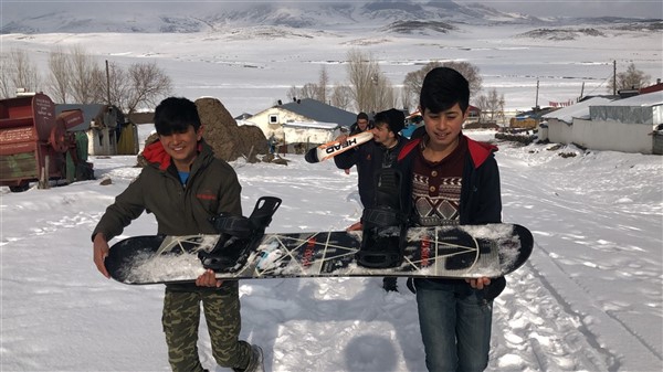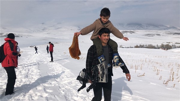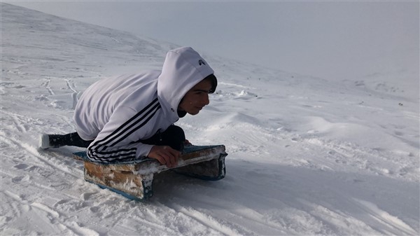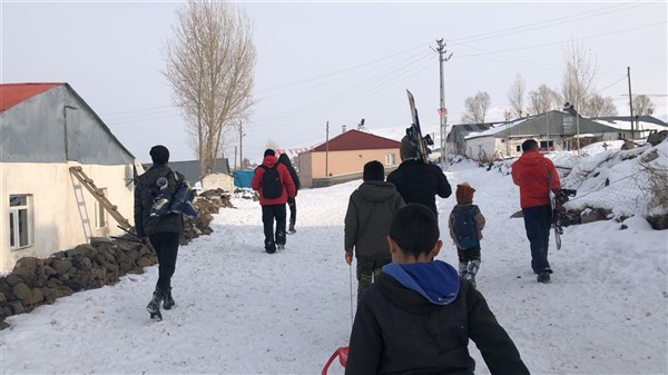 Paylaşımın ardından köye giden gazeteciler gençlerle birlikte 2600 rakımlı Elma Dağı’na tırmanmaya başladılar. Gençlere Muhtar Ergin Gündoğan ve çocuklarda eşlik etti. Çocukları omuzlarına ve sırtlarına alarak kayak yapacakları dağa tırmanan gençler 1.5 saat süren yolculuğun ardından zirveye ulaştılar ve kayağa başladılar.