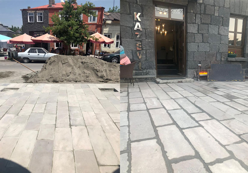 Kars Kaz Evi işletmecisi Nuran Oğuz Özyılmaz, işyerinin önündeki kaldırımların yenilenmesi için başlattığı çalışmayla örnek oldu.