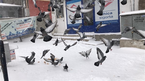 Aç kalan kuşların yemlerle beslendiği kentte vatandaşlar çocukları da kuş yemlemeye alıştırıyor.