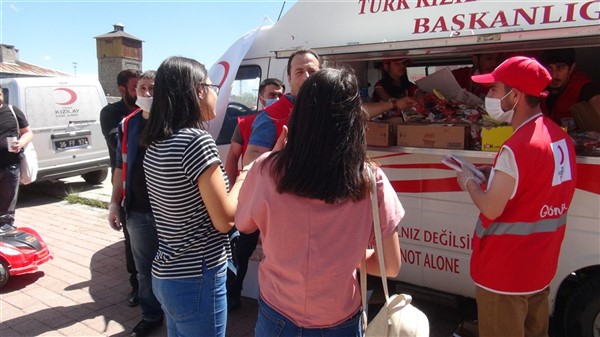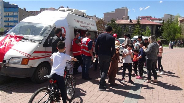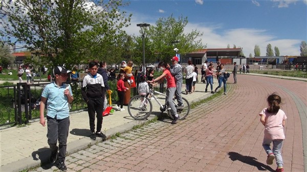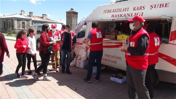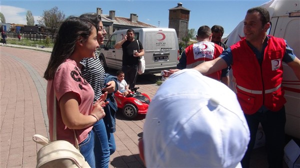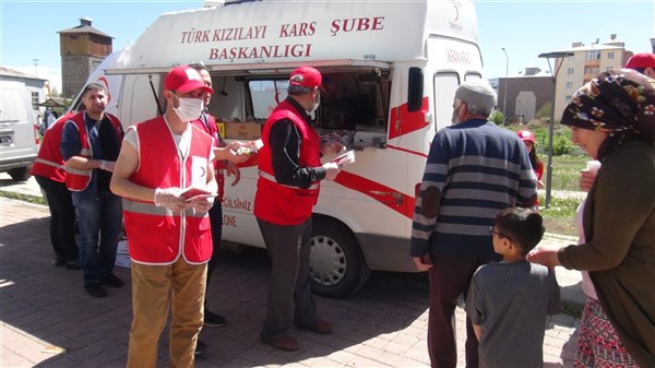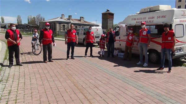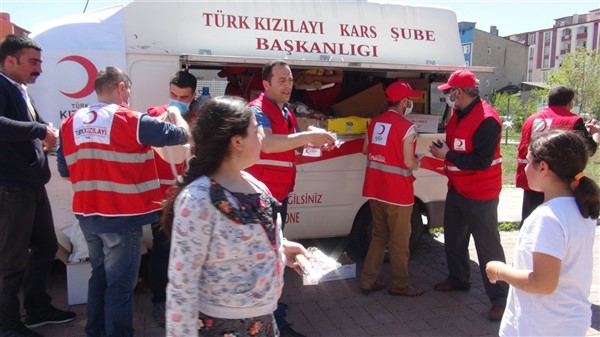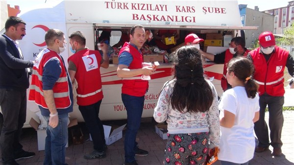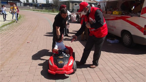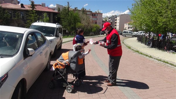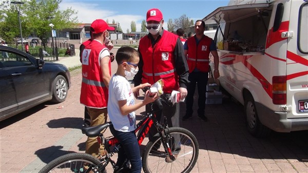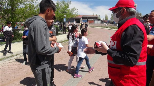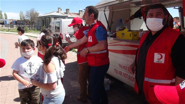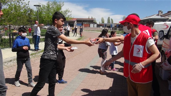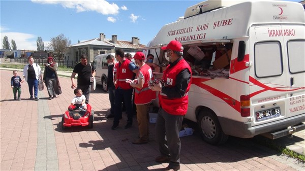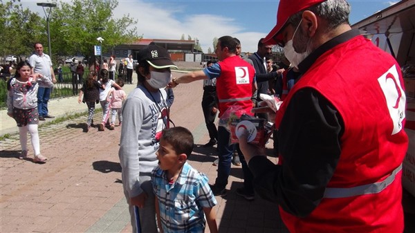 Aileleriyle birlikte parklara giden çocukları Türk Kızılay Kars Şubesi ikram aracı karşıladı. Kızılay yönetimi ve gönüllüleri park alanına getirdikleri ikram aracından hediye dağıtmaya başladı. Maske, meyve suyu, kek gibi ikramların yapıldığı alanda sosyal mesafe kuralları da hayata geçirildi. Görevliler çocuklara hediye dağıtırken ailelerine de maske dağıttı.