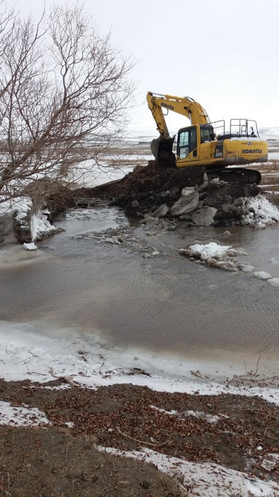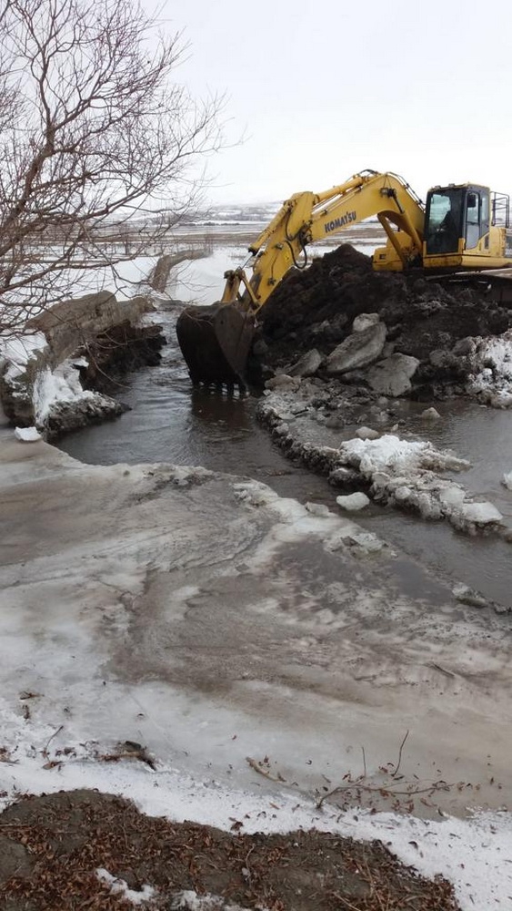 Kars İl Özel İdaresi ekipleri, Arpaçay Okçuoğlu köyü deresindeki buzlanma nedeniyle eriyen kar sularının derenin şişmesine sebep olmasından dolayı evlere su dolmasını önlemek amacıyla bir çalışma başlattı.