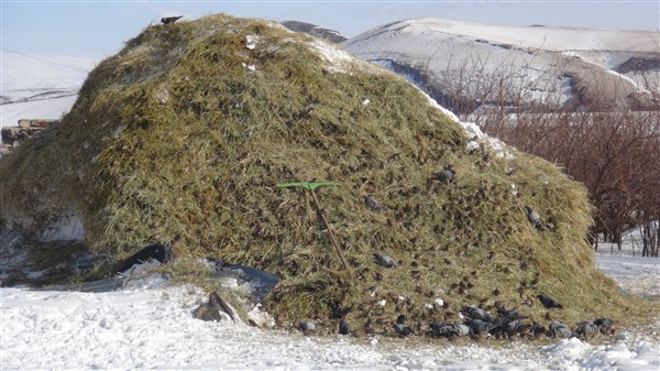 Kars’ta aç kuşlar ot yığınlarını mesken tuttu