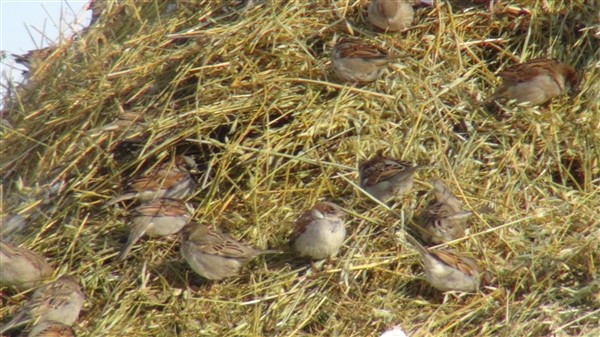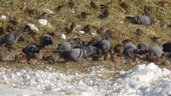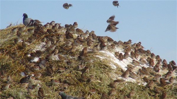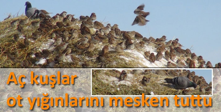 Kars’ta ağır geçen kış koşullarında aç kalan kuşlar köylerdeki ot yığınlarını mesken tuttu.