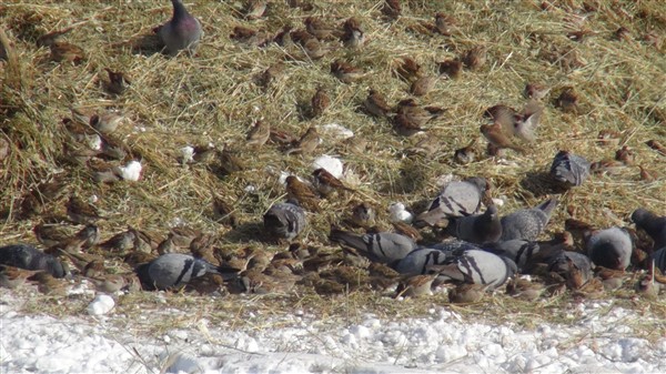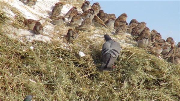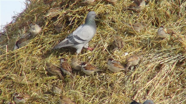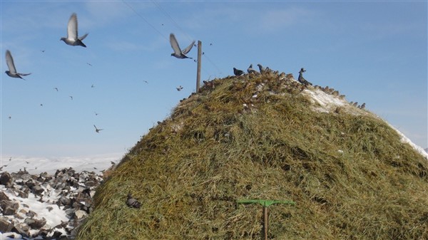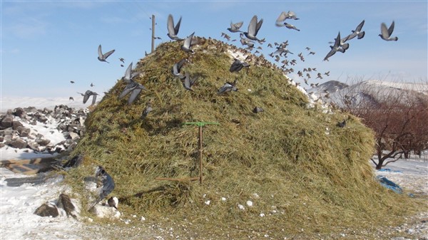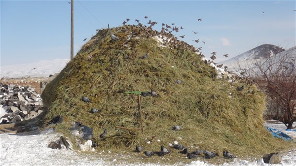 Yaz mevsiminde biçilen otlar kar ve yağmurda ıslanıp zayi olmaması için üzeri brandalarla örtülüyor. Brandalar hayvanlar için ot alındığında açılıyor. Muhtar Ziyettin Öncel de kuşların yığınlara hücum ettiğini görünce brandayı tamamen kaldırdı. Yüzlerce güvercin ve sığırcık içerisinde yulaf ve arpa yemi olan ot yığınlarına konarak açlıklarını gideriyor.