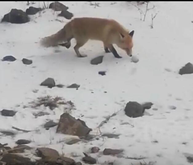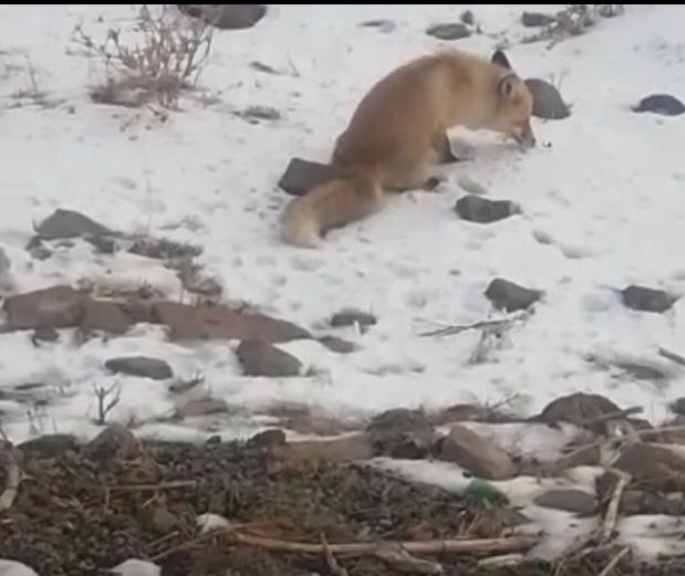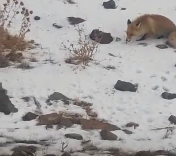 Tilkiyi yol kenarında halsiz şekilde beklerken gören hayvan severler, yanlarındaki yiyecekleri tilkiyle paylaştılar. Tilki de karlı zemine bırakılan yiyeceklerini afiyetle yedi. Tilki karnını doyurduktan sonra alandan uzaklaştı.