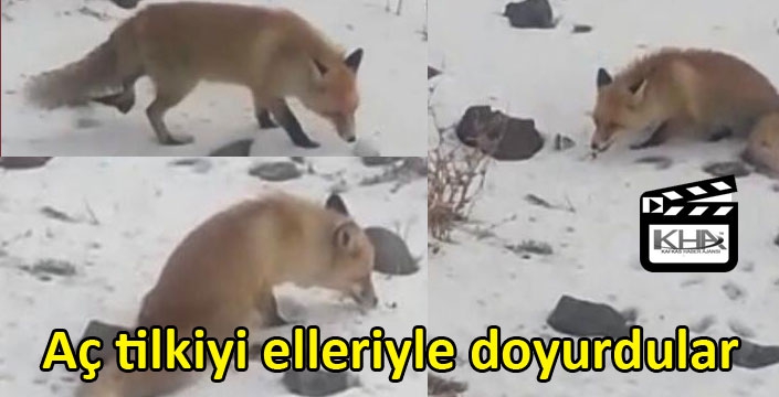 Kars’ta arabasıyla Arpaçay ilçesine doğru giden vatandaşlar yolda gördükleri aç tilkiyi elleriyle doyurdular.
