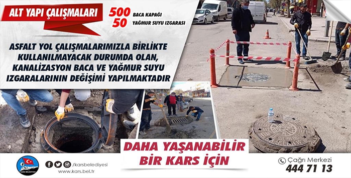 Kars Valisi / Belediye Başkan Vekili Türker Öksüz’ün talimatları doğrultusunda; Belediye ekiplerince devam eden asfalt yol çalışmalarımızla birlikte kullanılmayacak durumda olan kanalizasyon baca kapakları ve yağmur suyu ızgaraları yenileri ile değiştiriliyor.