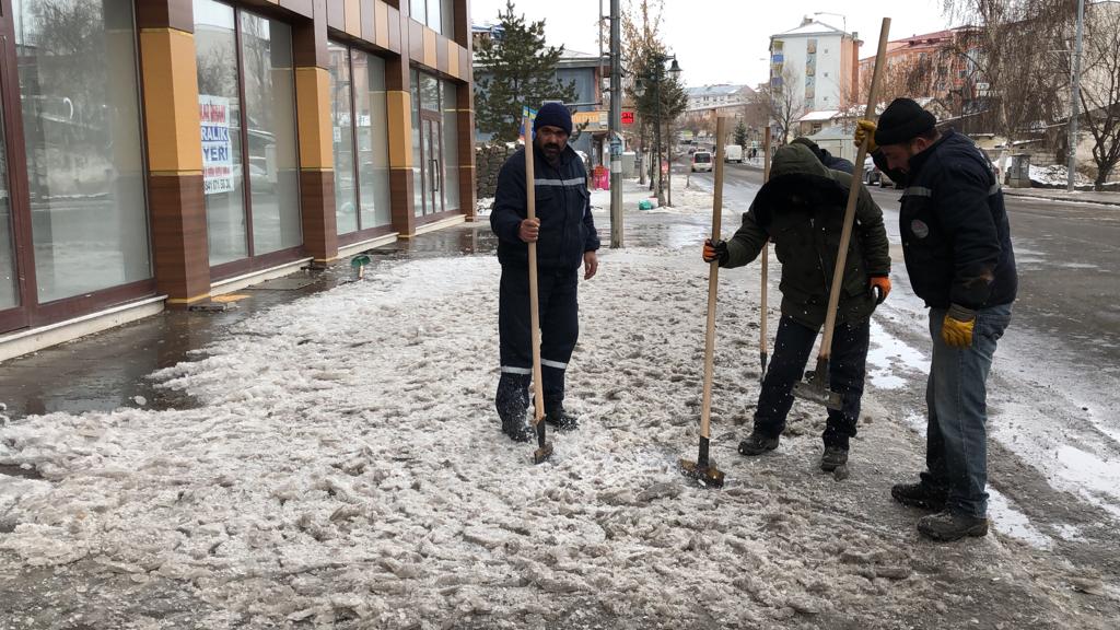 Kars’ta havaların soğuk gitmesi ile birlikte buz tutan kaldırımlar Belediye işçilerinin kontrolünde temizleniyor.