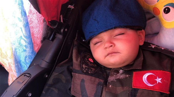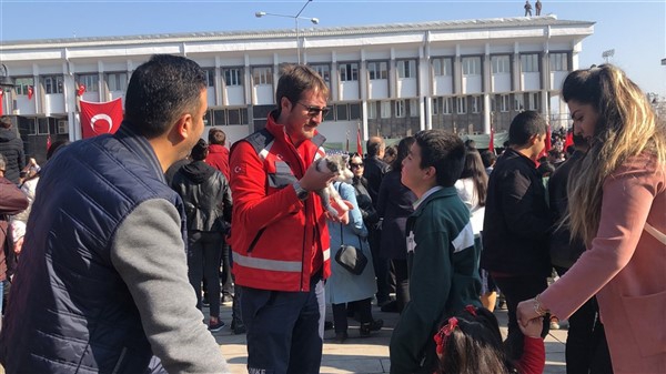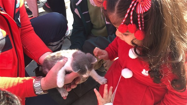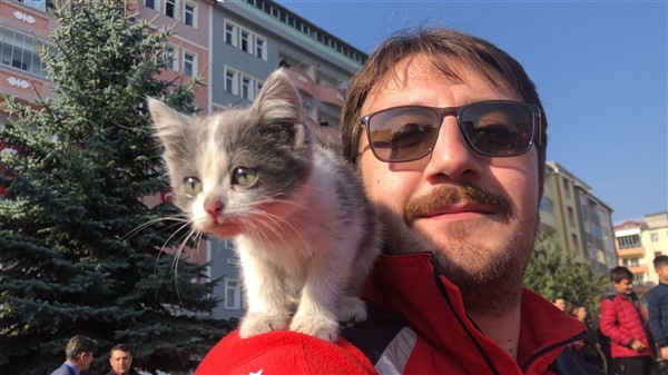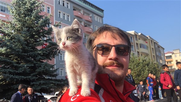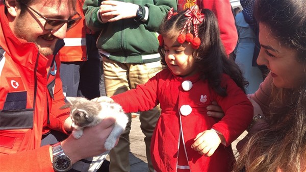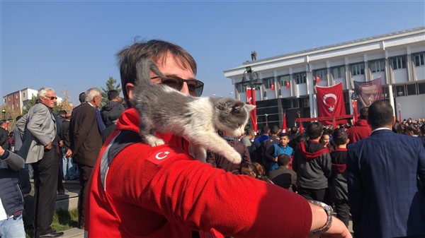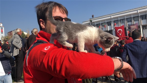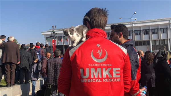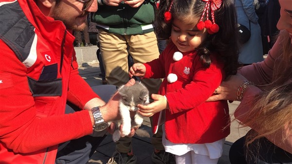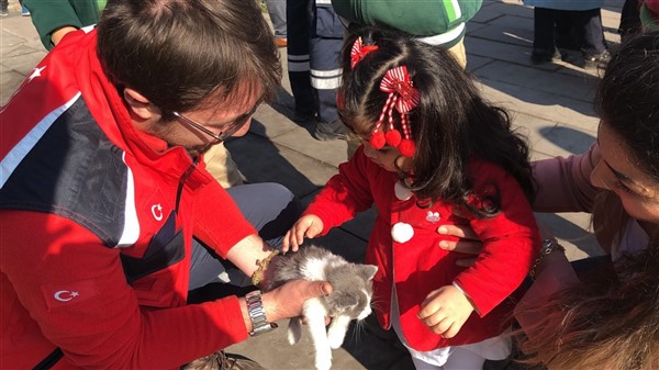 Bir UMKE görevlisi ise kalabalık arasında yolunu şaşıran kedi yavrusuna sahip çıktı. Yavru kediyi omuzlarına alarak koruyan UMKE görevlisi, uzun süre kediyi okşadı. UMKE görevlisinin bu şefkati çevredekilerin de dikkatini çekti. Özellikle de çocuklar UMKE görevlisinden yere indirmesini istedikleri kediyi severek çocukluklarını yaşadılar.