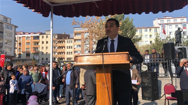 Vali Öksüz ayrıca, “Bilindiği üzere ülkemiz, yıllarca belimizi büken terör belasının yanında son yıllarda siyasi ve ekonomik saldırılara da maruz kalmış ve bu saldırılara karşı mücadele vermektedir. Emperyalist güçlerin maşası olan FETÖ tarafından ülkemizi yok etme amacıyla gerçekleştirilen 15 Temmuz hain darbe girişimi, akabinde yaşadığımız siyasi ve ekonomik saldırılar ve güney sınırlarımızda yaşanan gelişmeler, bize bundan 100 yıl önce yedi düvele karşı verdiğimiz gibi bir varoluş mücadelesini anımsatmaktadır. 100 yıl önce istiklalinden ve istikbalinden ödün vermeyeceğini tüm cihana en güçlü şekilde haykıran bu aziz millet, son günlerde yaşadığı bu olayları yine aziz milletimizin devletine ve iradesine sahip çıkma kararlılığı sonucu geri püskürterek bütün dünyaya çok önemli ve net mesajlar verilmiştir. Birçok alanda dışa bağımlı olmaktan kurtularak kendi ürettiği yerli ve milli silahlarla gerçekleştirdiği barış pınarı harekâtı ile emperyalist güçlerin bu coğrafya üzerindeki yüzyıllık kanlı oyunlarını boşa çıkartan devletimiz, bu coğrafyada olup bitenlere hiçbir zaman sessiz kalmamış her zaman mazlumun ve mağdurun yerinde yer almıştır.1923 ile 2023 arasında kurulan köprüde yine milletimizin azim ve kararlılığıyla yeni destanlar yazılmaktadır. Cumhuriyetimiz, demokrasimiz, güçlü ekonomimiz, yaptıklarımız ve yapabileceklerimiz dostlarımıza güven ve övünç kaynağı olarak örnek teşkil etmekte, milletimize düşmanlık hisleri besleyen karanlık güçleri ve vatan hainlerini ise korku ve telaşa düşürmektedir. Yaşadığımız bu kritik coğrafyadaki mevcut tüm olumsuzluklara rağmen; ortak tarih, ortak kader ve amaç birliği ile vatandaşlık kimliği ilkelerine dayanan temeller üzerinde yükselen cumhuriyetimiz sayesinde bu topraklar üzerinde yaşayan tüm vatandaşlarımız, tasada ve kıvançta bir ve bütün olmada, ocağını ve aşını paylaşmada ne kadar kardeş olduğunu ortaya koymuştur. Dahası, büyük bir millet ve devlet olmanın gereği olarak ecdadı gibi milyonları aşan vatansız insanlara kucağını açmış, dünyanın neresinde olursa olsun mazlumlara sahip çıkmış, zalimin karşısında olmuş, yakın bölgesine ve ötesine barış, adalet ve refahı yaymaya çalışmıştır. Bugün geldiğimiz noktadan daha aydınlık yarınlara ancak cumhuriyetle varabileceğinin bilincinde olan aziz milletimiz, cumhuriyet rejimiyle kıvançlıdır. Cumhuriyetimizin bizleri ulaştırdığı nokta, hepimize heyecan ve ümit vermekte, birlik ve beraberliğimizi pekiştirmekte, milletçe daha iri ve diri olma azmimizi yenilemektedir. Her yerde ve her ferdimizle milletçe devletimizin bekası, milletimizin refahı için çalışmaya, dünyanın gelişmiş ülkeleri ile her alanda yarışmaya ve evrensel insani değerlerinin savunulmasına öncülük etmeye, mazlumların yanında, zalimlerin ve vatan hainlerinin ise karşısında olmaya, her zamankinden daha fazla azimli ve kararlıyız. Ne mutlu ki, bunun için gerekli olan güce, akla, birikime ve tecrübeye sahibiz. Bu inançla, milli ve manevi değerlerimize sahip çıkmaya devam edeceğiz. Gazi Mustafa Kemal Atatürk’ü, kahraman ecdadımızı, aziz şehit ve gazilerimizi milletimizin kalbinde ve gönlünde ebediyete kadar yaşatacağız ve asla unutmayacağız. Biliyoruz ki; ay yıldızlı şanlı al bayrağımızın altında vakit; tek yürek, tek vücut ve tek millet olma vaktidir. Vakit, akıl ve gönül birliği vaktidir. Vakit, ecdattan teslim alınan mirası geleceğimizin teminatı gençlere en iyi şekilde teslim edebilmek için gayret gösterme vaktidir. “ ifadelerine yer verdi.