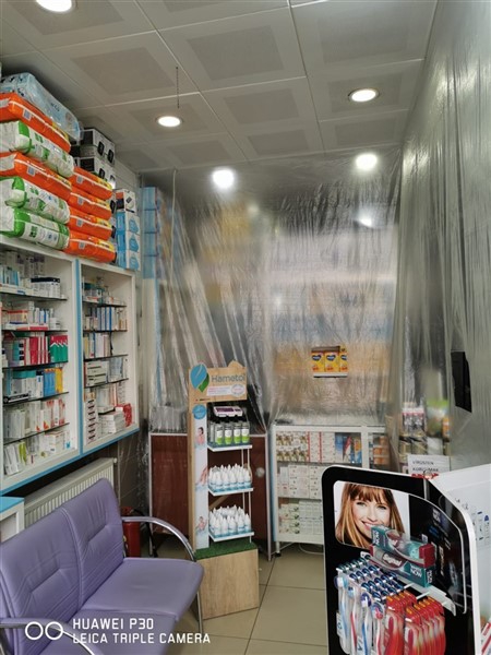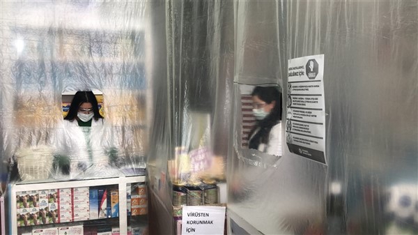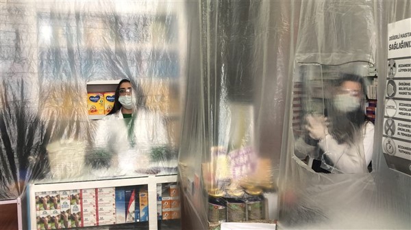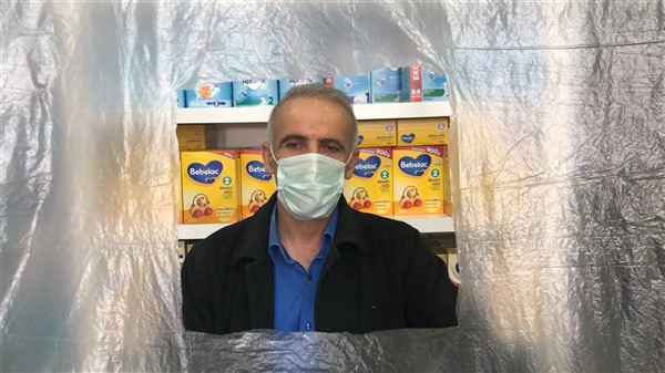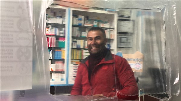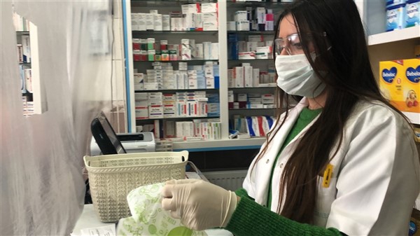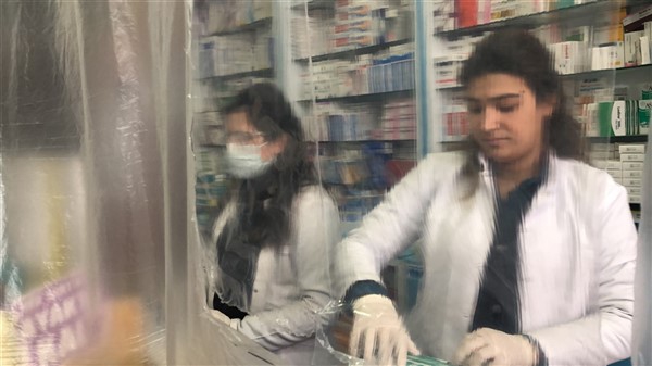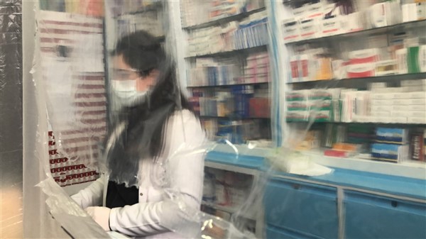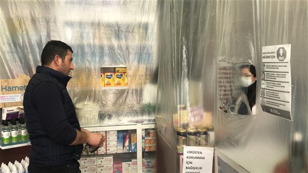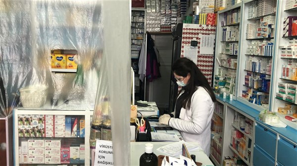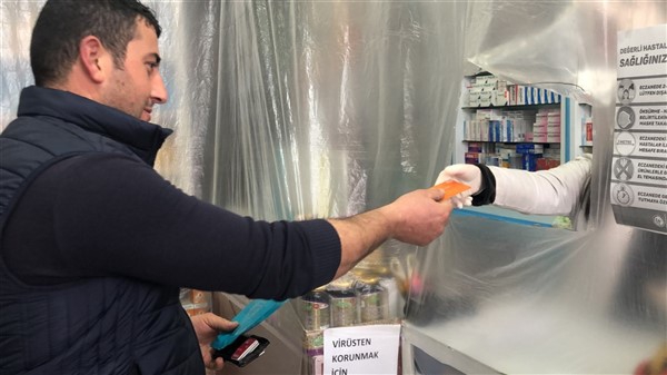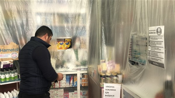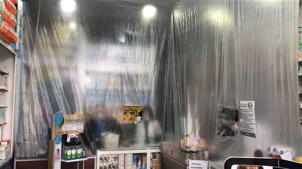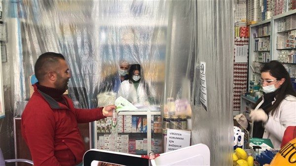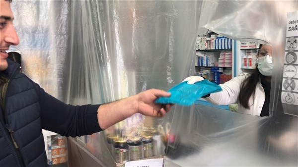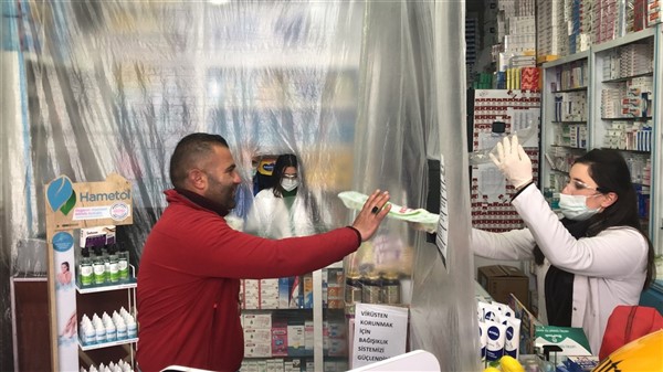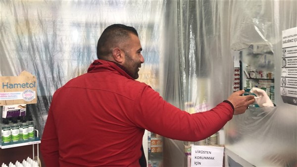 Eczane yetkilisi Ali Yoldaş, çalışanları, kendilerini ve müşterilerini korumak amacıyla tezgah ile müşterilerin bulunduğu alanı şeffaf branda ile ayırdı. Maske ve eldiven takarak mesailerine devam eden çalışanlar, müşteriler ile ilaç ve para alışverişini de brandada açtıkları deliklerden yapıyor.