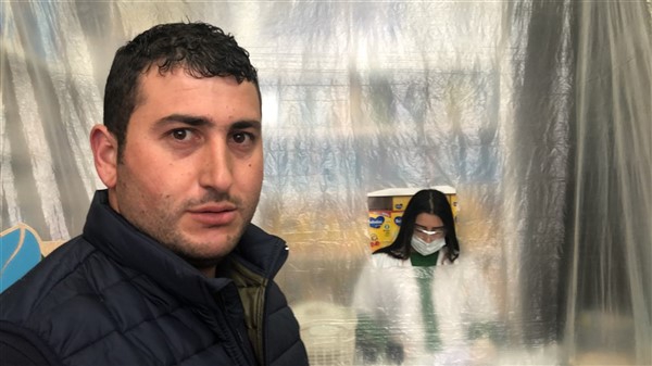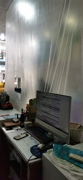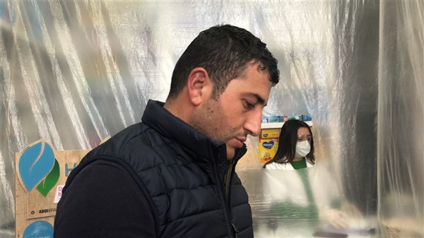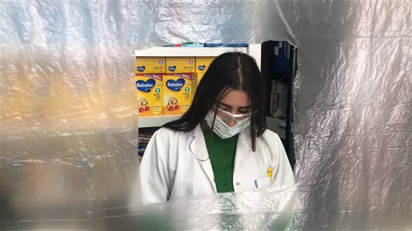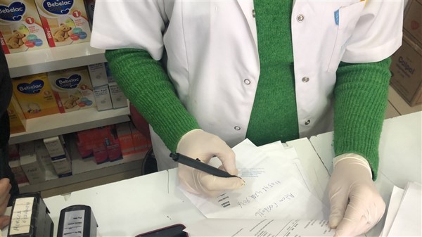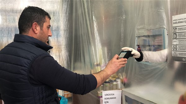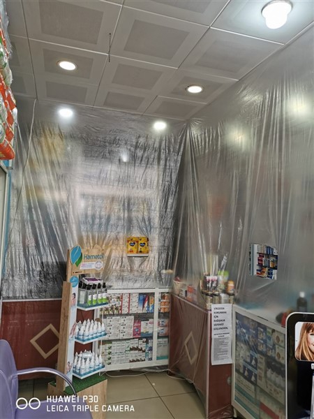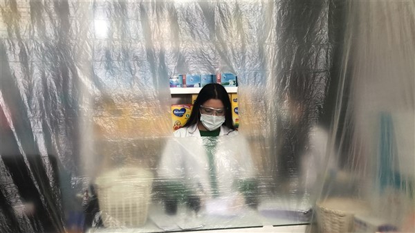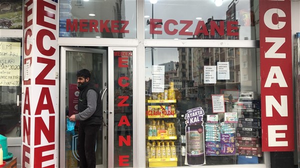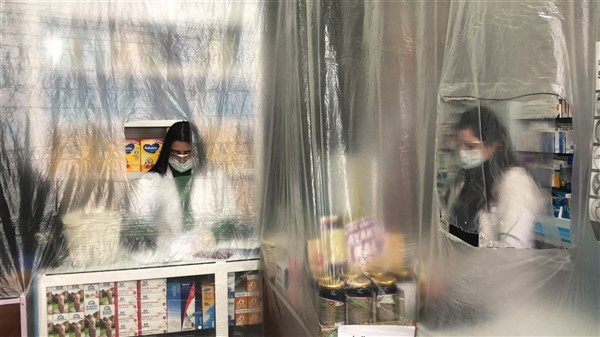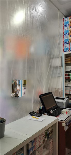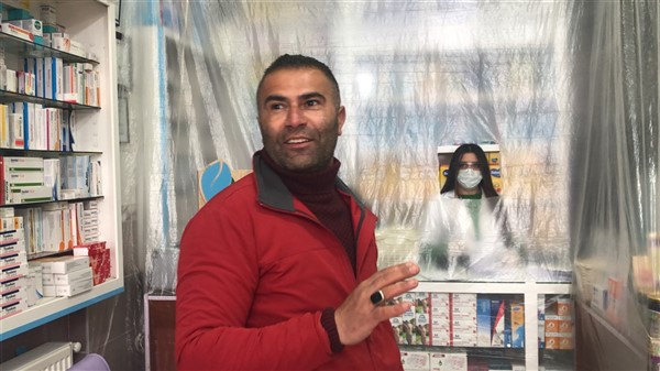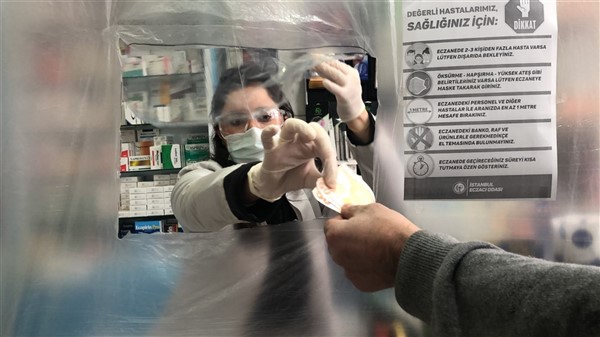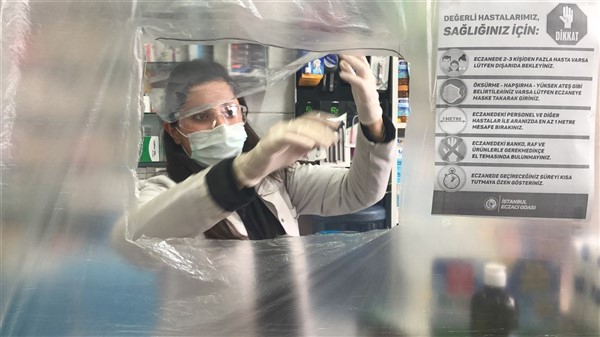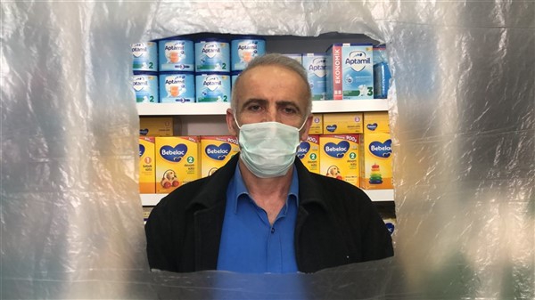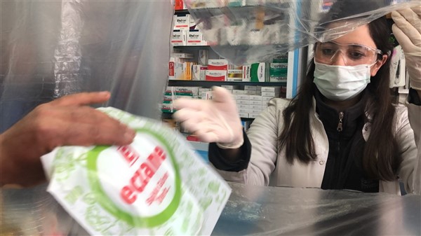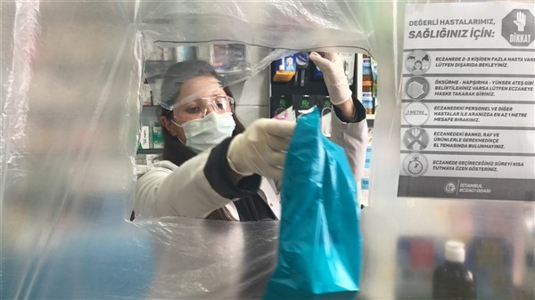 Eczane yetkilisi Ali Yoldaş, çalışanları, kendilerini ve müşterilerini korumak amacıyla tezgah ile müşterilerin bulunduğu alanı şeffaf branda ile ayırdı. Maske ve eldiven takarak mesailerine devam eden çalışanlar, müşteriler ile ilaç ve para alışverişini de brandada açtıkları deliklerden yapıyor.
