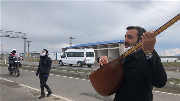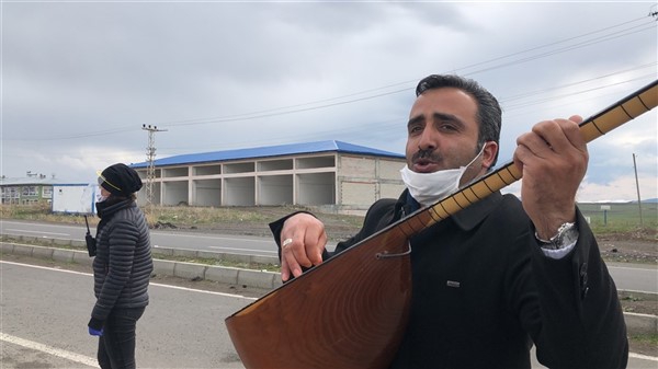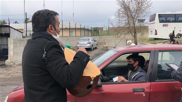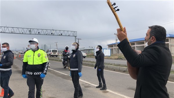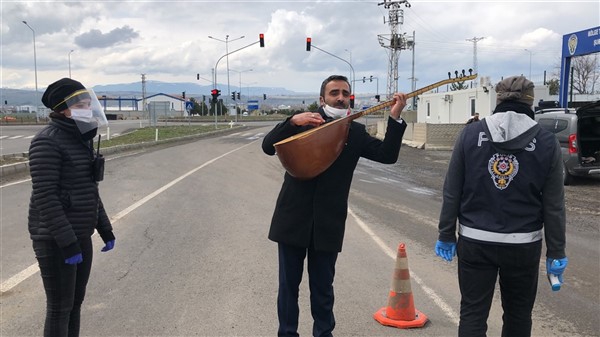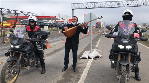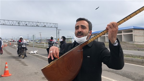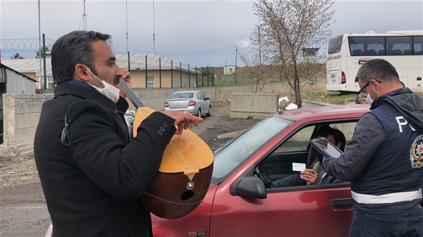 Kars'ta koronavirüs tedbirleri kapsamında kentin giriş noktalarında görev yapan, polis ve sağlık ekiplerini ziyaret eden Halk Ozanı Arif Gülcani (39) sazı ve sözüyle görevlilere moral verdi. Gülcani, "Hastalığın çıktığı ilk günden itibaren büyük bir gayretle gece-gündüz demeden çalışan polis ve sağlık ekiplerimize moral vermek için ziyaret ettim. Hepsini çok seviyoruz" dedi.