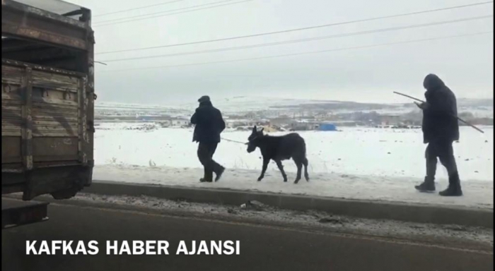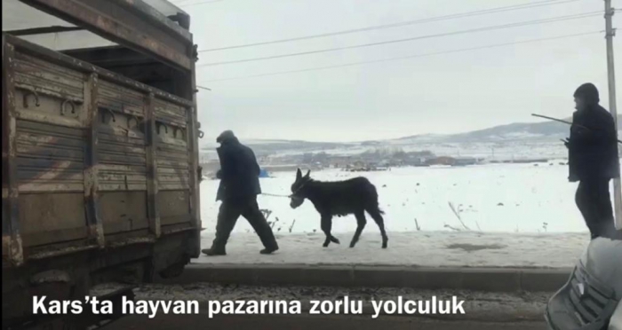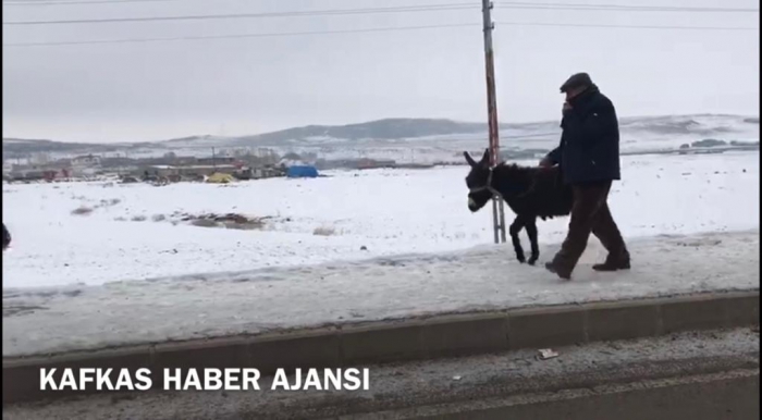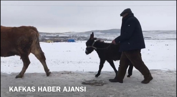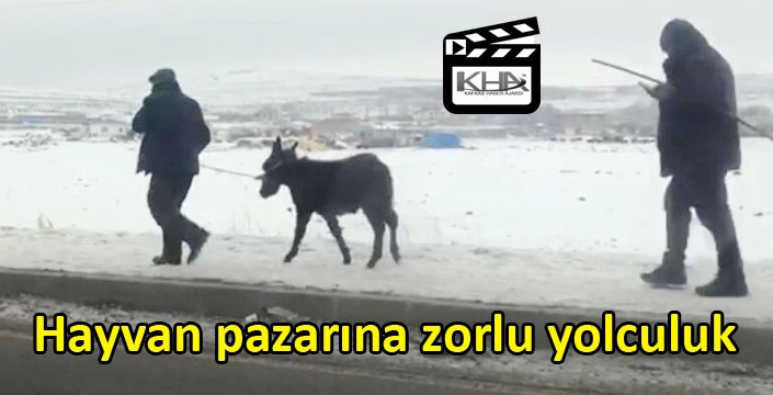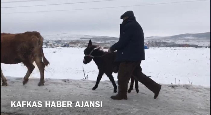 Kars’ta büyükbaş hayvanlarını pazara götürmek için karlı yolda yürüyen vatandaşın eşeğiyle birlikte yaptığı yolculuk kameralara böyle yakalandı.