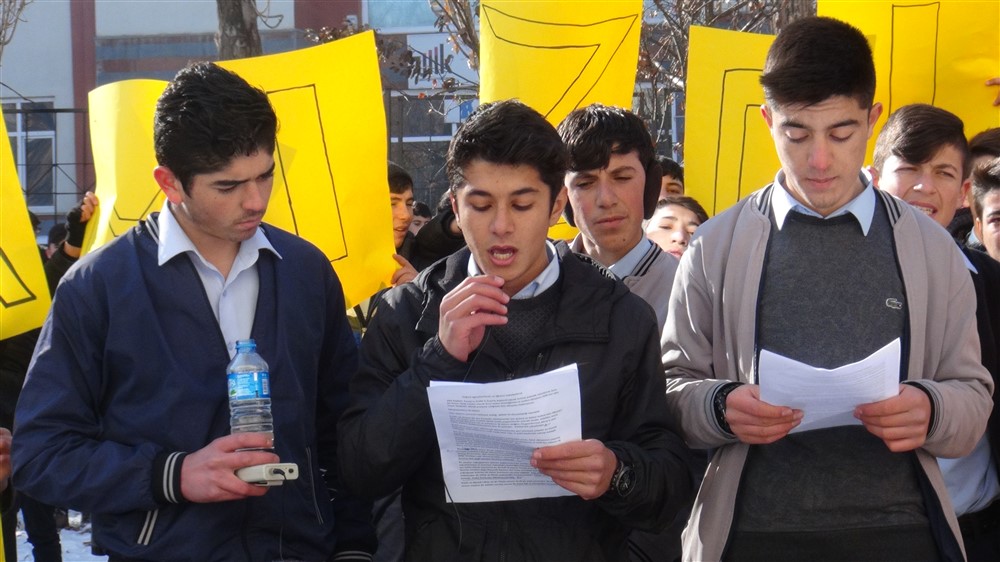 “Sevdamızdır Kudüs Umudumuzdur” sloganıyla hazırlanan kınama açıklamasını 11 Sınıf Öğrencisi Muhammed İkbal Gül okudu. Gül, “ABD başkanı Trump’ın Kudüs’ü İsrail’in başkenti olarak tanıma yolunda adımlarına karşı biz İmam Hatip Liseleri olarak bunu kabul etmediğimizi ve suskun dünyanın HÜR sesi olan İmam Hatipliler olarak protesto ettiğimizi tüm dünyaya haykırıyoruz.” dedi.