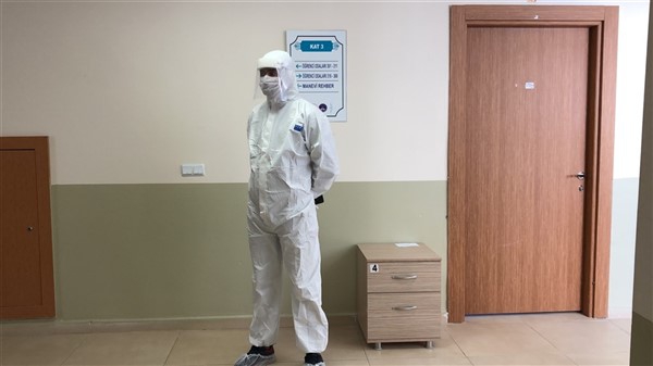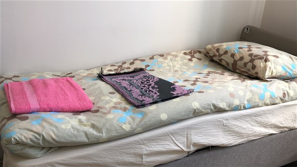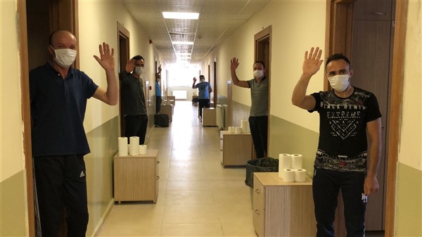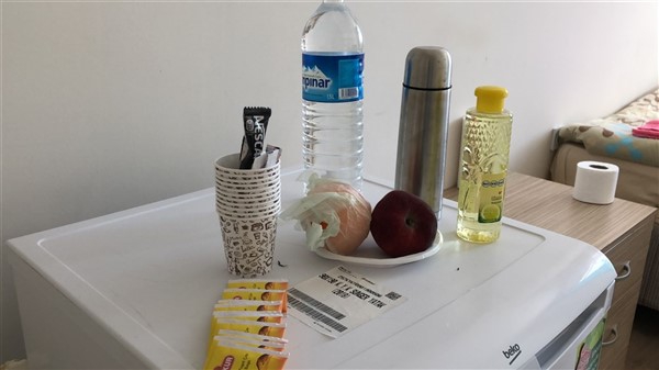 Karantina altındaki misafirler birer kişilik konforlu odalarda kalıyor. Dolabı, yatağı, masası, sandalyesinin yanında birer adet de seccade bulunuyor. Ayrıca masalarda günlük meyve ihtiyaçları bulunduruluyor. Dezenfektanların da eksik edilmediği odalarda tuvalet ve banyo da mevcut.