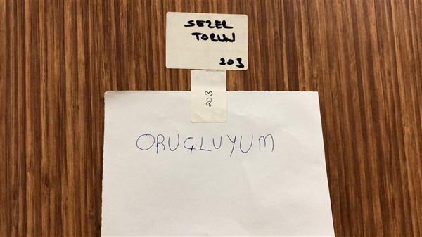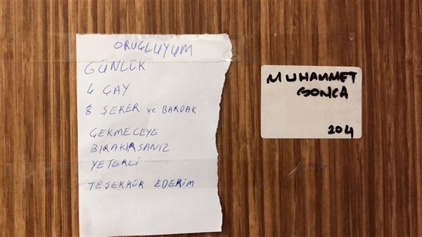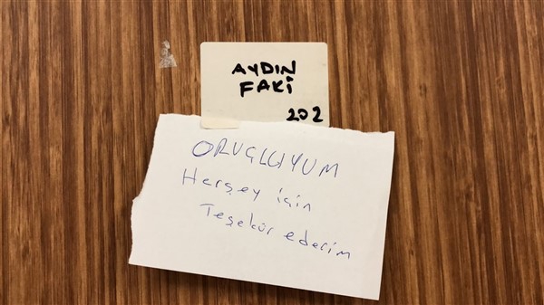Oruç tutanlar görevlilere kolaylık olsun diye kapılarına notlar asıyor. “Oruçluyum”, “Oruçluyum herkese teşekkür ederim”, “Oruçluyum; günlük 4 çay, 8 şeker ve bardak çekmeceye bırakırsanız yeterli. Teşekkür ederim” notlarını okuyan görevliler istekleri buna göre temin edip kapı girişlerindeki masanın çekmecesine bırakıyorlar.
