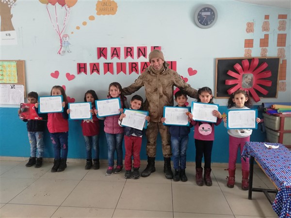 Bu kapsamda köy okulları ziyaret edilerek öğrencilerin karne sevincine ortak olundu. Çocuklarda Jandarmayı tanıtıcı hoş bir anı bırakmak amacıyla düzenlenen etkinlik kapsamında köy okulu öğrencileriyle bir araya gelen jandarma personelleri, çocuklara karne hediyeleri vererek, karnelerini kendi elleriyle teslim etmenin mutluluğunu yaşadılar.