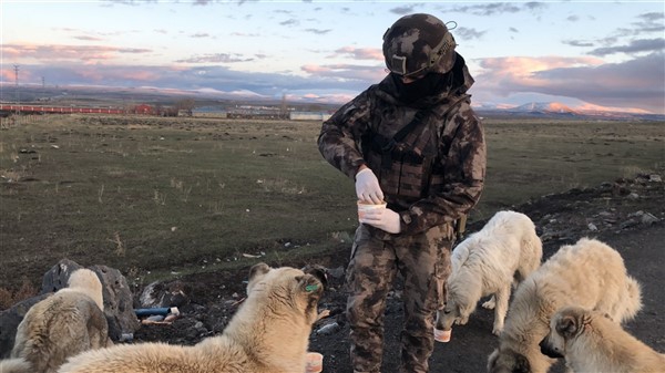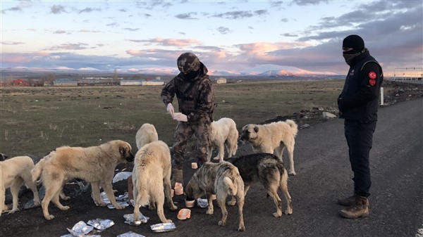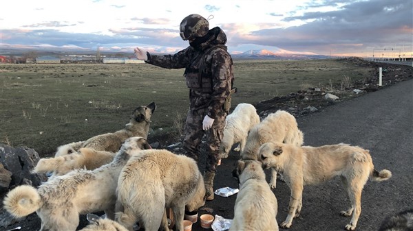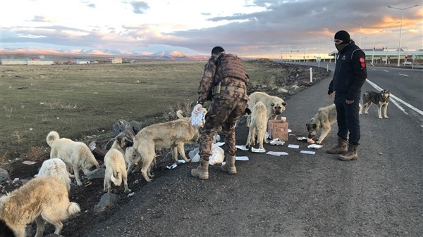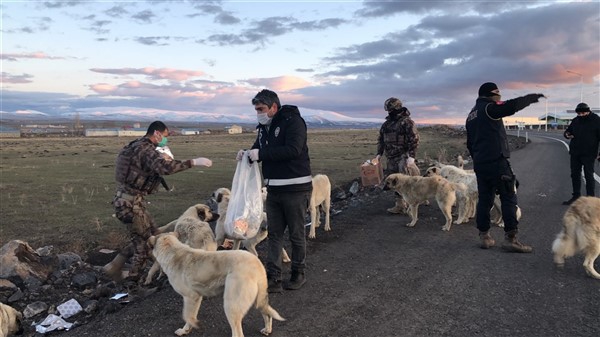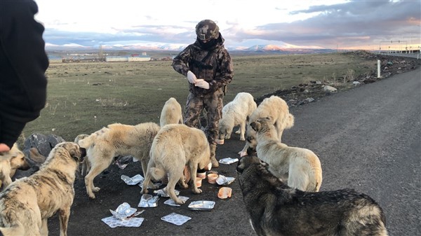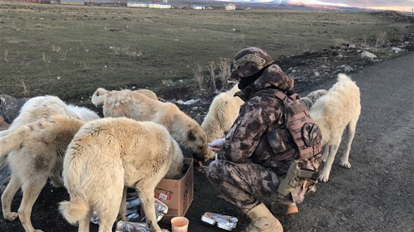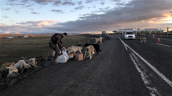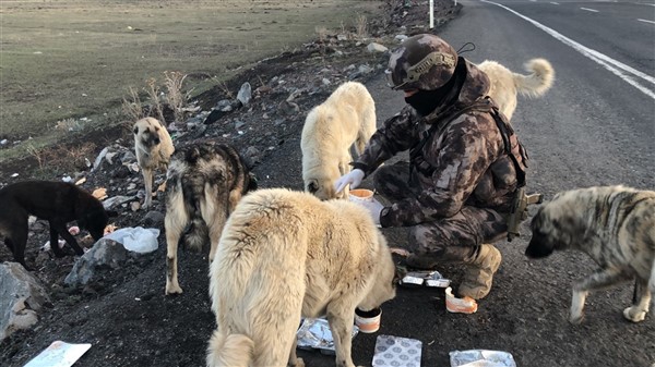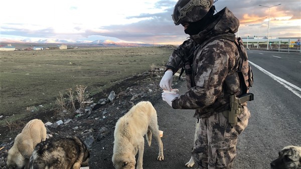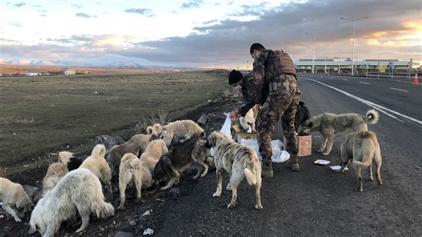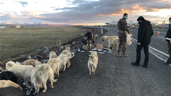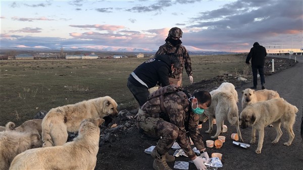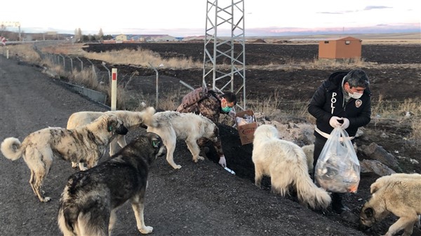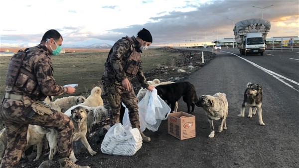 Kars'ta koronovirüs tedbirleri nedeniyle uygulamanın yapıldığı kent giriş çıkışlarındaki kontrol noktalarında emniyet güçleri sokak köpekleriyle yiyeceklerini paylaşıyorlar. Köpekleri elleriyle doyuran polisler çöp atıklarını da topladıktan sonra alandan ayrılarak görevlerine dönüyorlar.