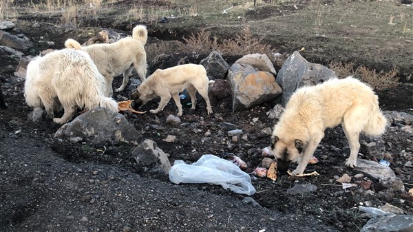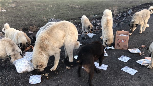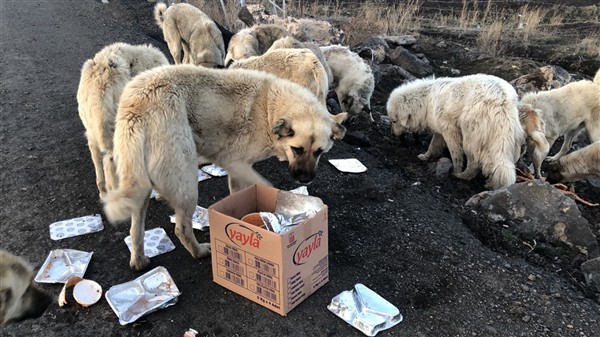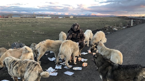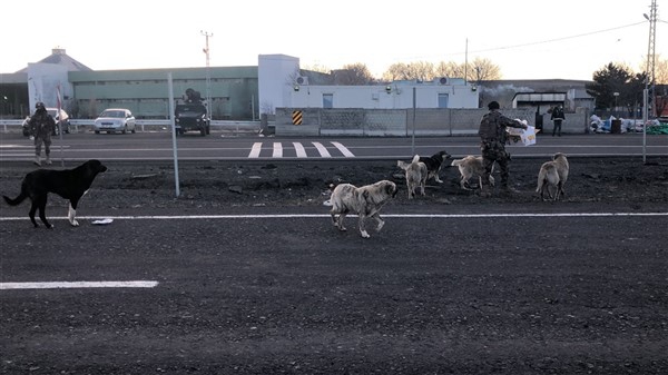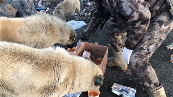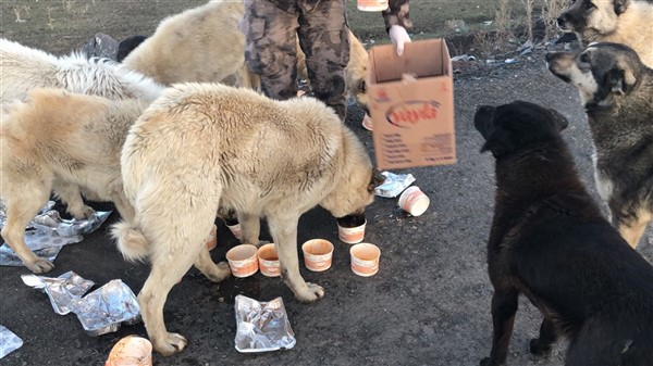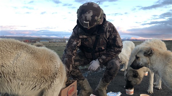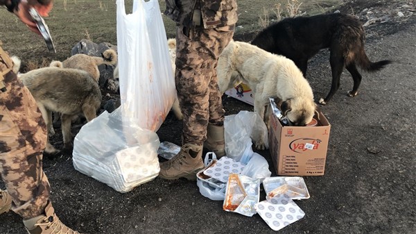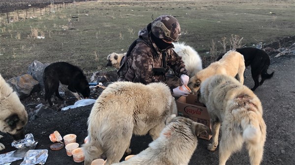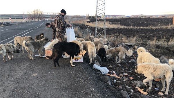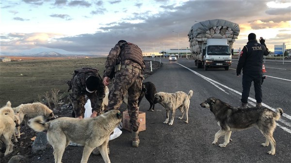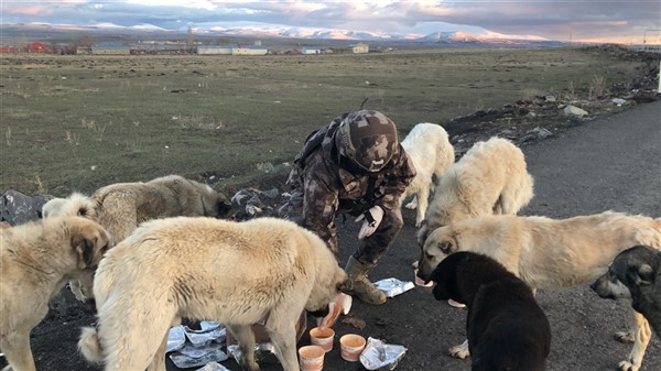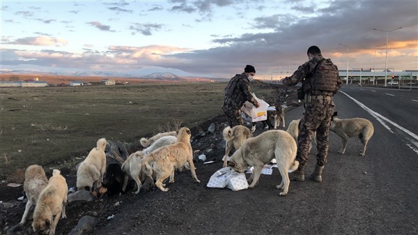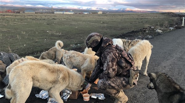Kars'ta koronovirüs tedbirleri nedeniyle uygulamanın yapıldığı kent giriş çıkışlarındaki kontrol noktalarında emniyet güçleri sokak köpekleriyle yiyeceklerini paylaşıyorlar. Köpekleri elleriyle doyuran polisler çöp atıklarını da topladıktan sonra alandan ayrılarak görevlerine dönüyorlar.
