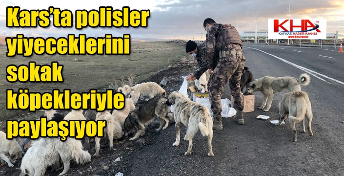 Kars’ta polisler yiyeceklerini sokak köpekleriyle paylaşıyor