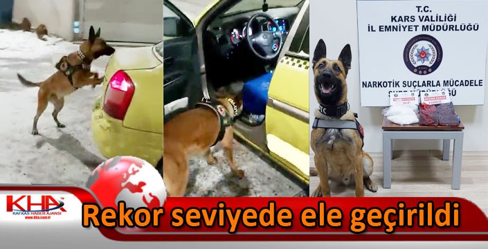Kars İl Emniyet Müdürlüğü Narkotik Suçlarla Mücadele Şube Müdürlüğü ekiplerince Narkotik Dedektör Köpeği ODİN'in yardımı ile yapılan aramada Kars'ta şuana kadar rekor seviyede en fazla uyuşturucu madde miktarı ele geçirildi.